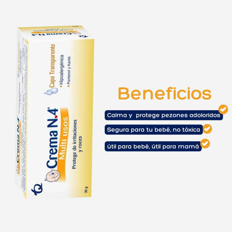 La Crema N4 Multiusos es una aliada esencial para el cuidado diario del bebé y de la mamá. Su fórmula hipoalergénica y suave crea una capa transparente que protege contra irritaciones, rozaduras y agentes externos. Enriquecida con Pantenol y Karité, ayuda a regenerar la piel, calmar molestias y mantenerla hidratada.