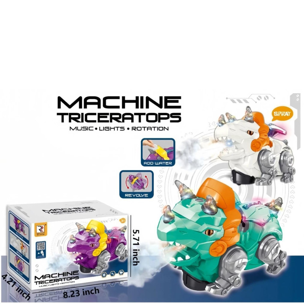 Este no es un dinosaurio común; es un juguete interactivo de alta tecnología diseñado para capturar la imaginación. El Machine Triceratops combina un diseño robótico futurista con la imponente figura del dinosaurio, presentando colores vibrantes (verde turquesa o morado, según el modelo).
