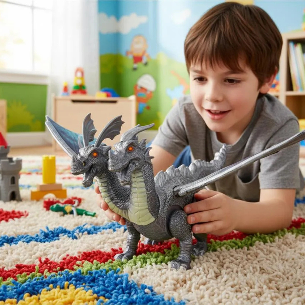 El Dragón de Dos Cabezas Twin Head Dragon es una figura de acción electrónica y mecánica que lleva la aventura prehistórica o mitológica a la sala de juegos. Diseñado para niños a partir de 3 años, este dragón destaca por su imponente apariencia con dos cabezas feroces.
