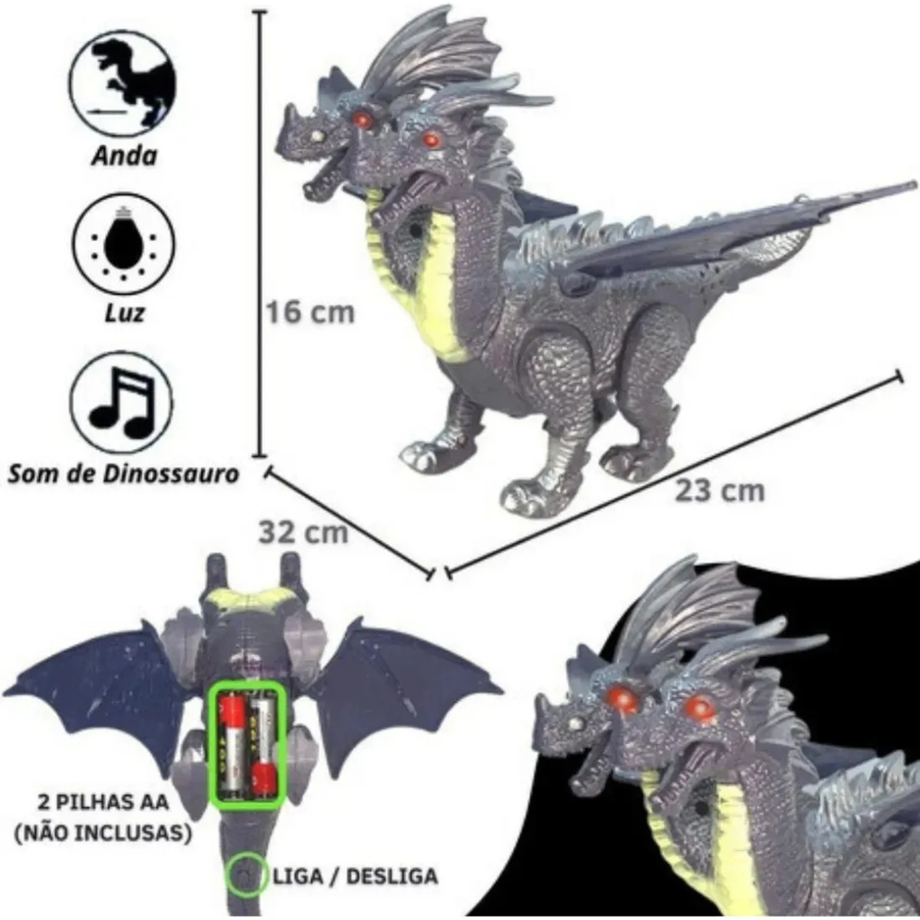 El juguete es interactivo y autónomo: una vez encendido (utiliza 2 pilas AA), el dragón camina o se mueve hacia adelante, emite un sonido de simulación (rugido) y activa luces brillantes en sus ojos. Esta combinación de movimiento, luz y sonido crea una experiencia de juego inmersiva y emocionante.