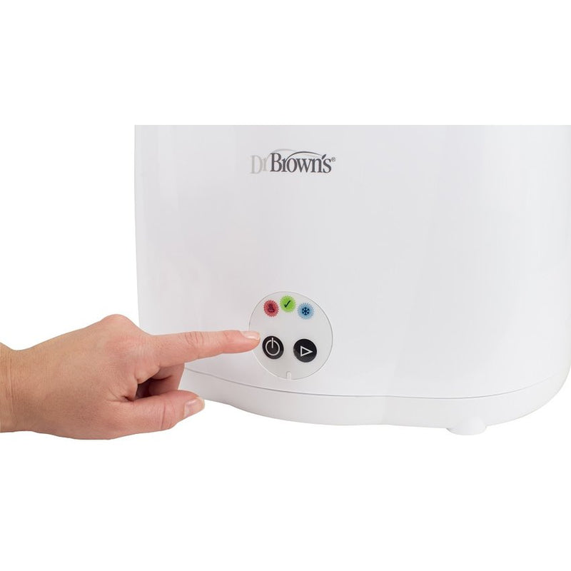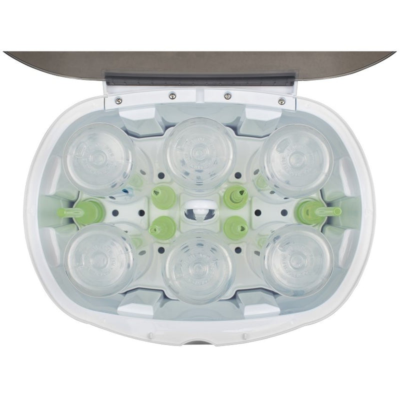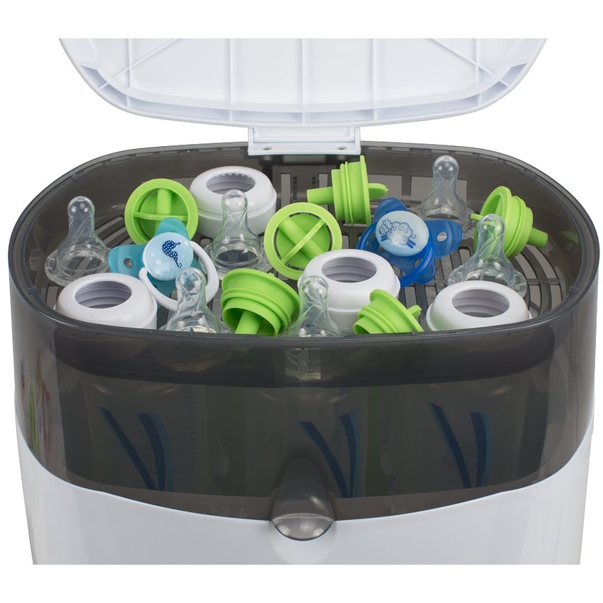 Esterilice una carga de biberones, repuestos, chupetes y más. Con controles electrónicos con indicadores de ciclo, este esterilizador de biberones de encimera es fácil de usar. En el interior hay una bandeja extraíble diseñada para colocar los biberones a la perfección, mientras que una bandeja de accesorios incorporada contiene las piezas, las tetinas y los chupetes.