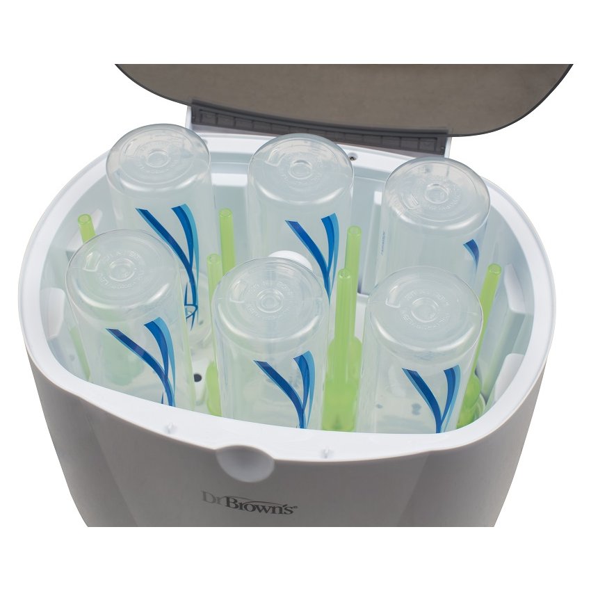 Bandeja desprendible caben todos los teteros Dr. Brown® y casi todos los teteros de otras marcas. Esta bandeja de fácil manejo facilita la carga de teteros y los posiciona para que el vapor se dirija cada tetero. Una taza de medir hace fácil añadir la cantidad ideal de agua cada vez.