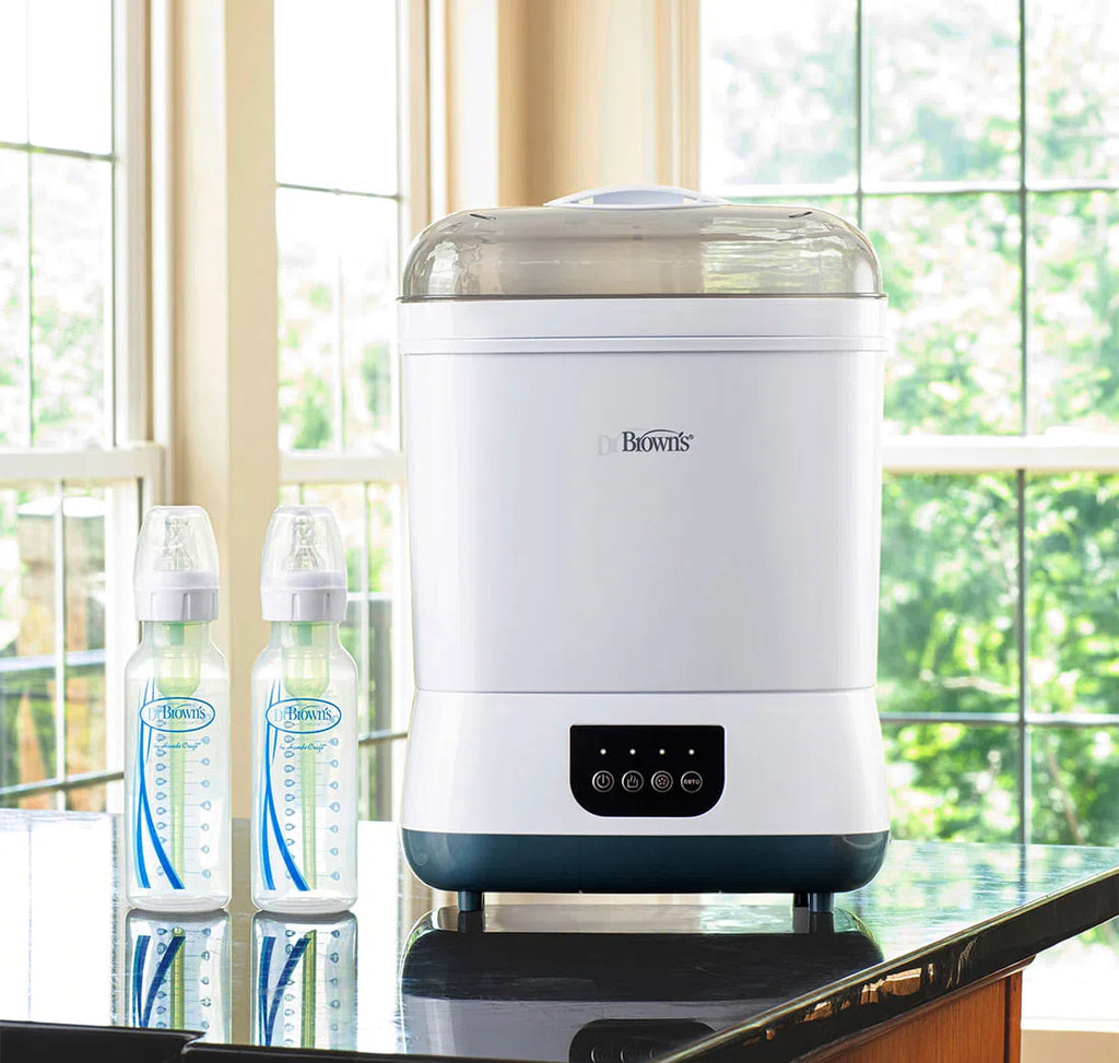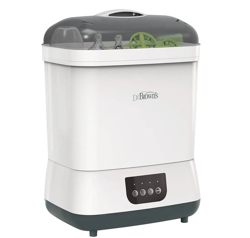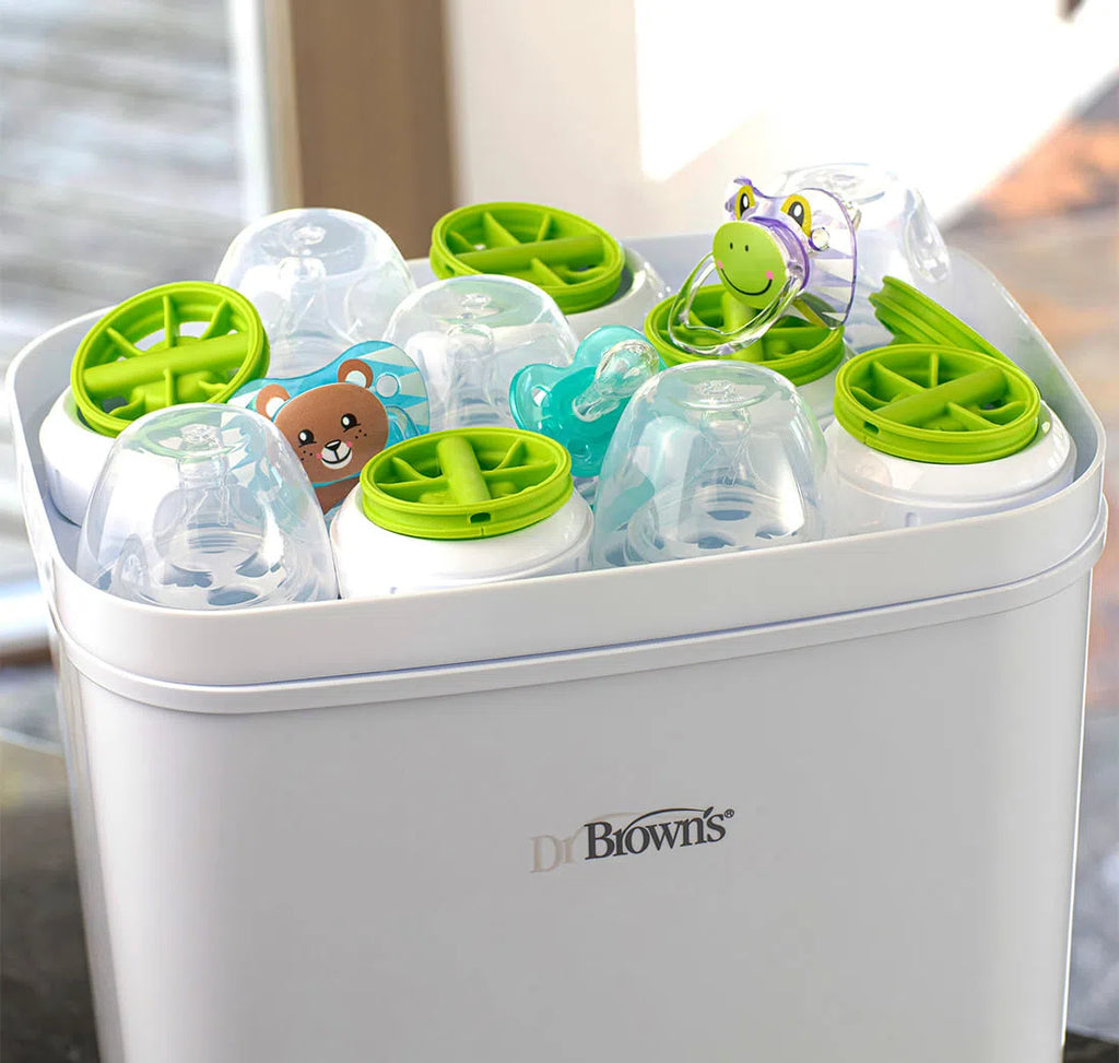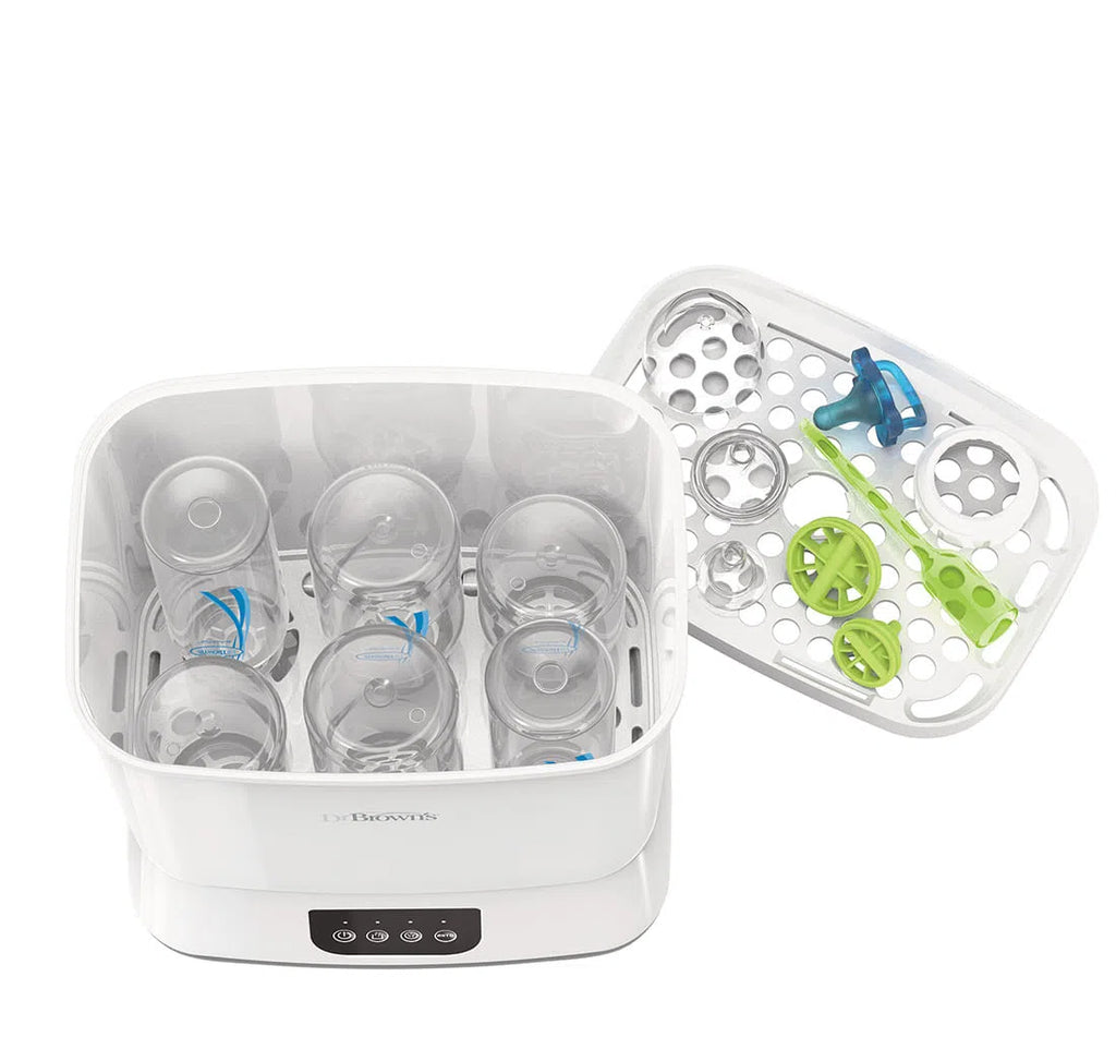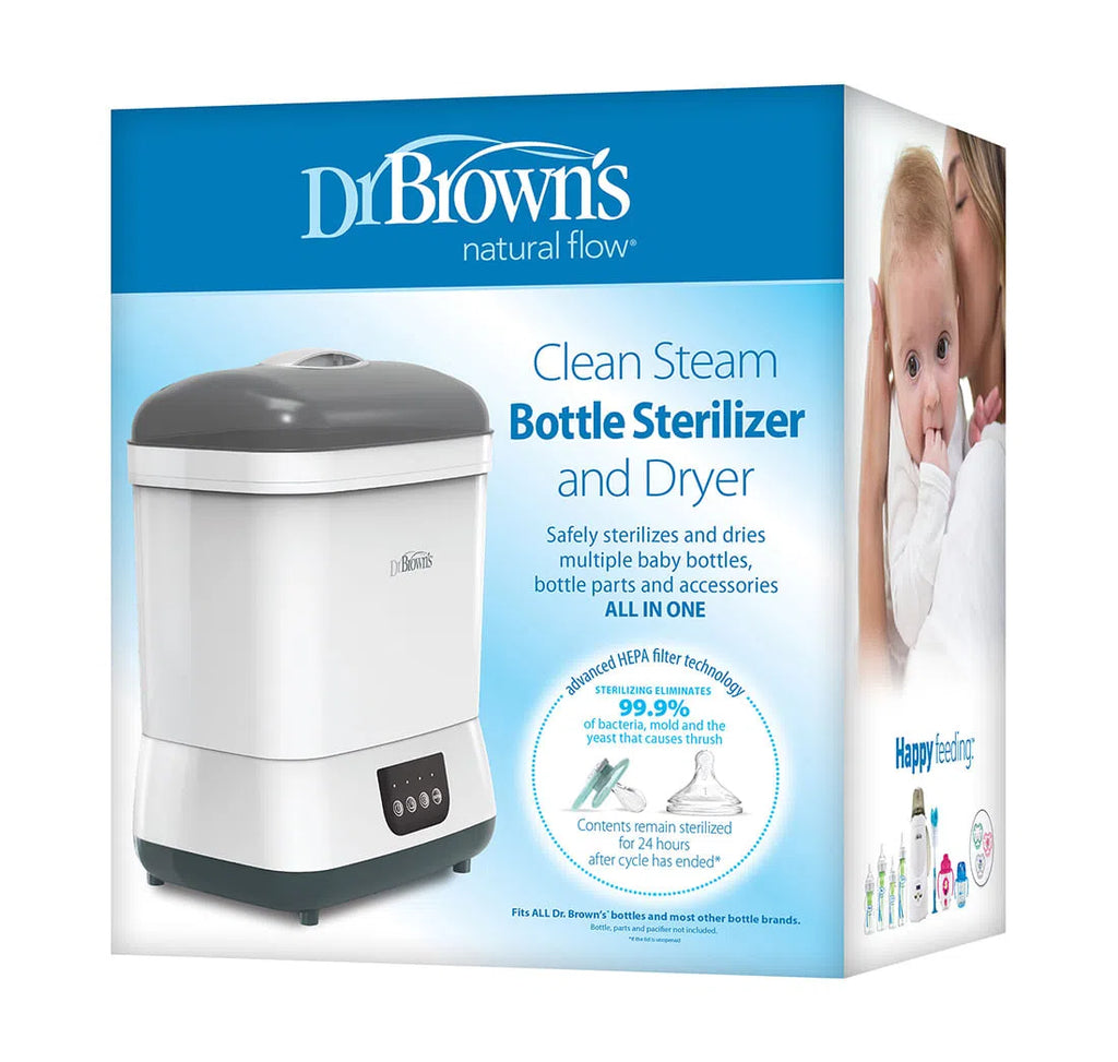¡Limpiar con vapor, secar, almacenar y más! El esterilizador y secador de botellas de vapor limpio Dr. Brown's ™ ofrece el paquete completo, esteriliza al vapor y seque hasta seis biberones a la vez, además de las piezas del extractor de leche, los chupetes y los mordedores. Clean Steam elimina el 99,9% de las bacterias, el moho y la levadura que causa la candidiasis.