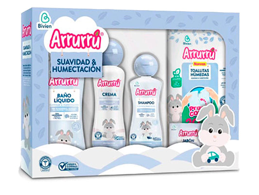 Hermoso estuche de Arurrú de su línea Suavidad y Humectación. Toda la calidad y tradición de arrurú en un solo kit. Los productos que incluye este estuche componen la rutina básica de aseo de tú bebé.