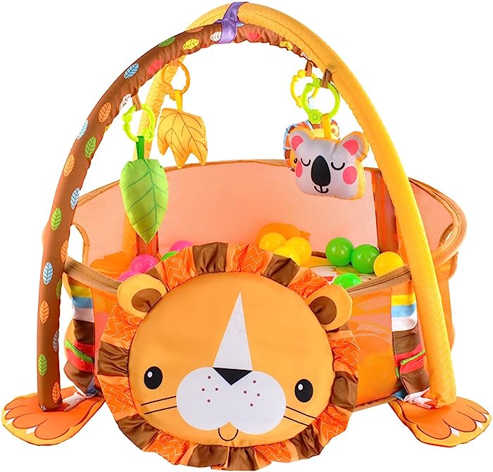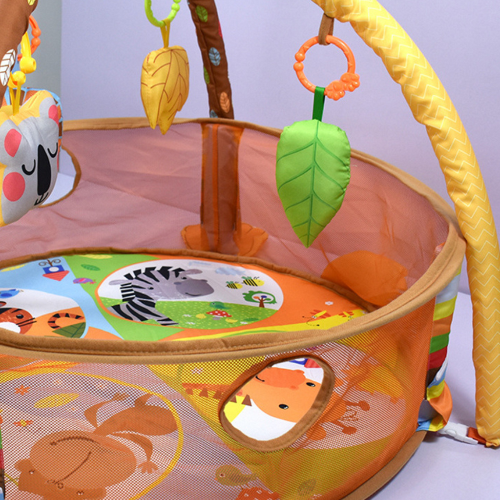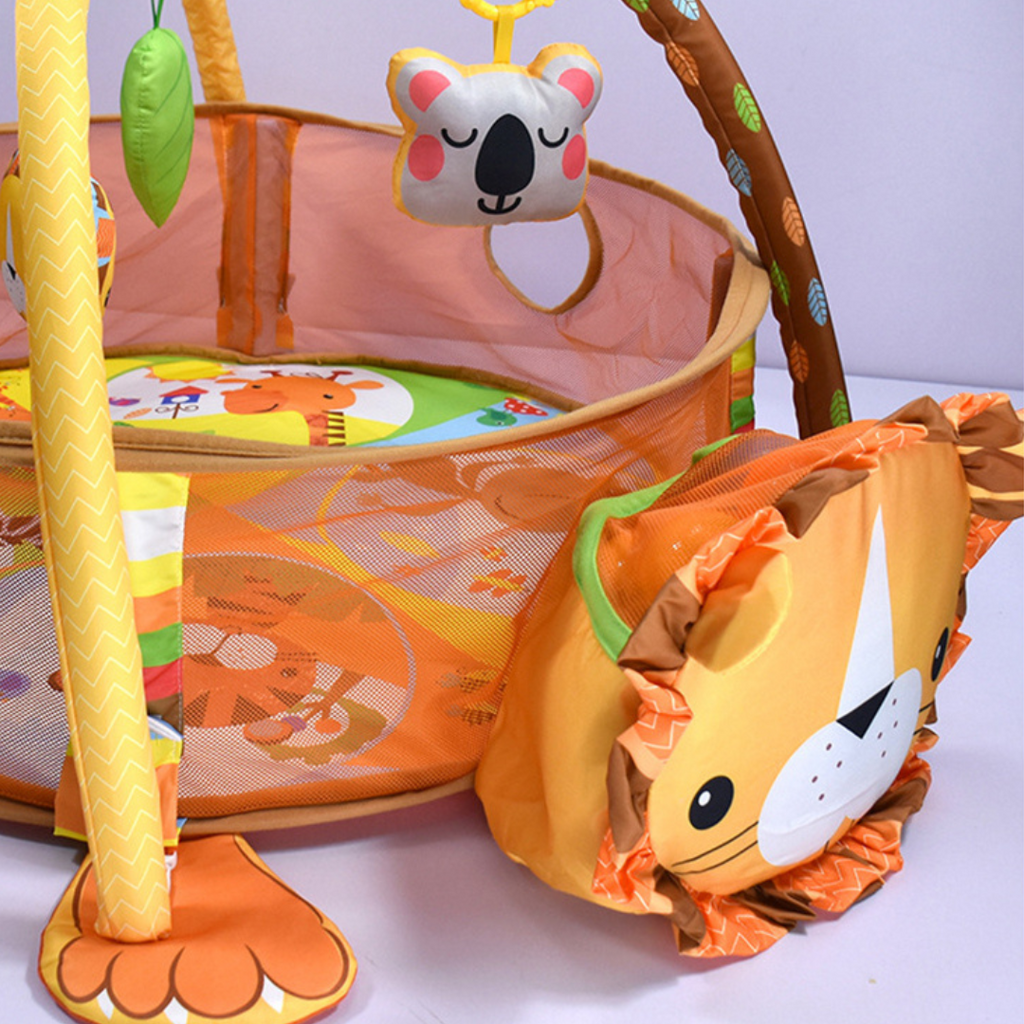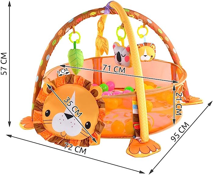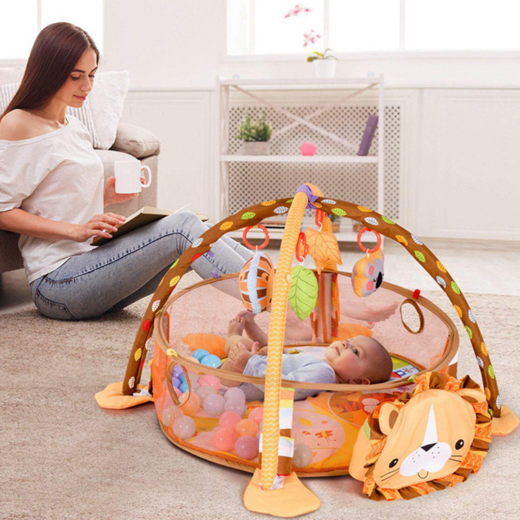 - El gimnasio para bebe es multifuncional se puede convertir en tres posiciones: 1. Corral con tapetes, juguetes y pelotas. 2. Corral con pelotas 3. alfombra para bebe con juguetes