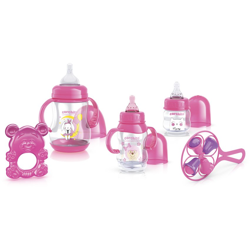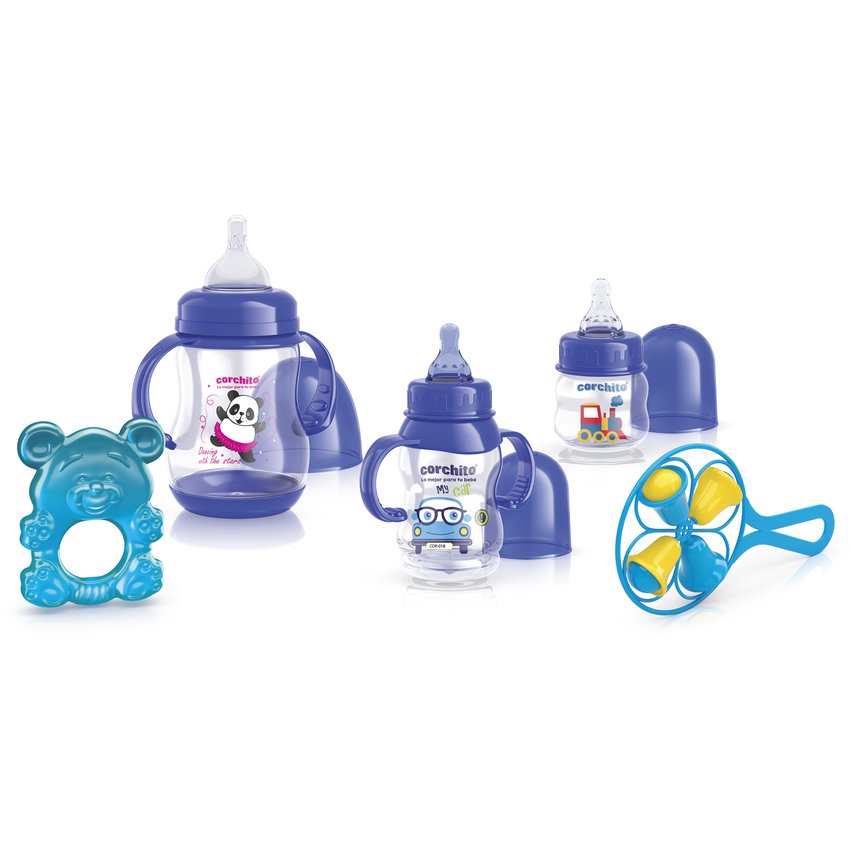 El kit tetero contiene 3 biberones para cada una de las etapas de alimentación del bebé, adicional 2 accesorios: un llamadientes sin relleno que proporciona un intenso efecto de masaje y un sonajero que estimula el desarrollo sensorial del bebé.