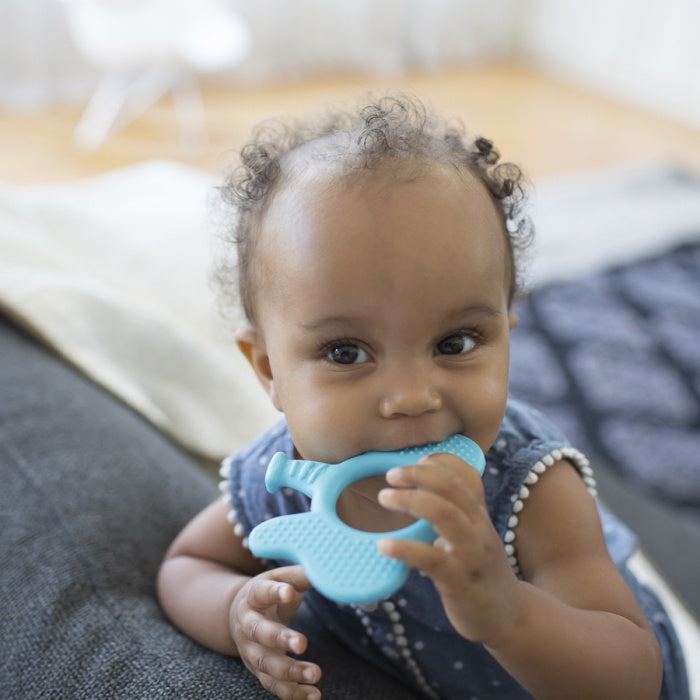 Llamadientes elaborado en superficie suave y texturizada diseñada para masajear las encías, calmando las molestias que causan los dientes al salir.