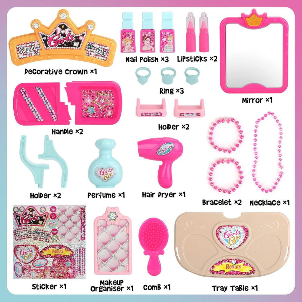 • Accesorios incluidos: Contiene una variedad de piezas como cepillo, espejo, secador de juguete, y maquillaje de fantasía no tóxico.