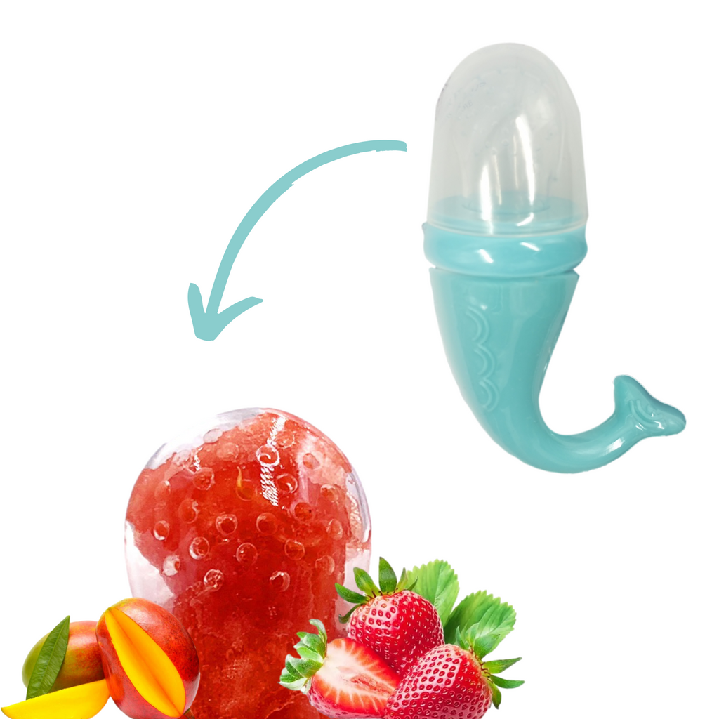 El alimentador de silicona tiene pequeños orificios que dejan pasar suficiente comida para que el bebé se alimente por sí mismo de manera segura. Es suave pero duradero y puede contener cualquier cosa, desde alimentos frescos hasta golosinas congeladas.