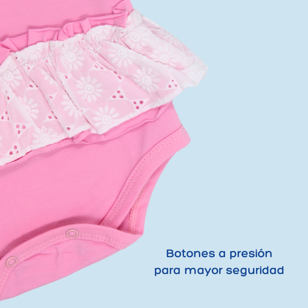 Hermoso mameluco con boleros y diseño cruzado en su parte posterior! Cierre con botones a presión en la parte inferior para facilitar la puesta de la prenda. Cálido tejido de algodón con tacto suave. Elementos de adorno