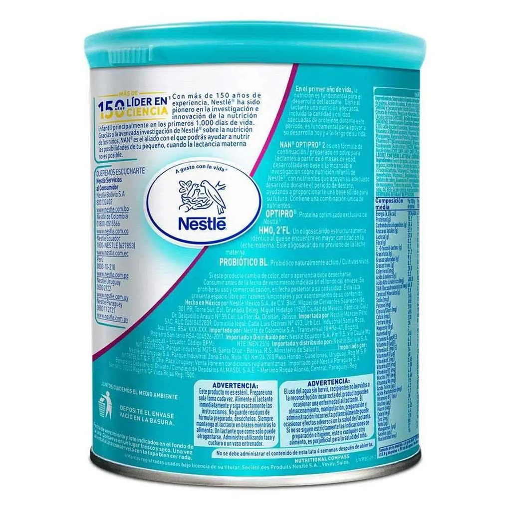 NAN PRO 2 es una fórmula láctea indicada a partir del sexto mes de vida (lactantes de 6 a 24 meses), adecuada como parte liquida de la alimentación de lactantes sanos, cuando no reciben lactancia materna. Ahora con HMO optimiza la proteína gracias a OPTIPRO, tecnologia patentada por Nestlé que apoya la correcta maduración de los órganos del bebé y una ganancia de peso saludable garantizando un optimo crecimiento y desarrollo. Ahora a través de los HMO refuerza el sistema de defensas del bebé.