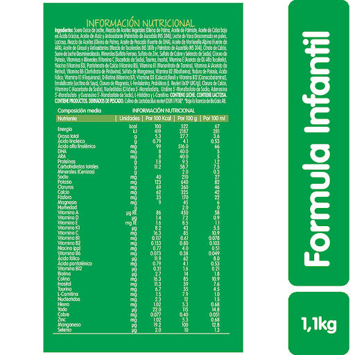 - Ingredientes: Suero de leche desmineralizado en polvo, Mezcla de aceites vegetales [Oleína de Palma, Palmiste, Canola, Maíz y Antioxidante (Palmitato de Ascorbilo)], Jarabe de Glucosa en polvo, Leche descremada en polvo, Citrato de Calcio, Emulsificante (Lecitina de Soya), Minerales [Sulfato Ferroso, Sulfato de Zinc, Sulfato de Cobre y Selenato de Sodio], Vitaminas y Minerales [Vitamina C, Taurina, Inositol, Vitamina E, Niacina, Pantotenato de Calcio, Vitamina B1, Vitamina A, Vitamina B6, Sulfato de Manganeso, Vitamina B2, Yoduro de Potasio, Ácido Fólico, Vitamina K1, Biotina, Vitamina D3 y Vitamina B12], Cloruro de Magnesio, Probióticos [Lactobacillus reuteri 1x106 UFC/g], Cloruro de Sodio, Cloruro de Potasio, Citrato de Potasio y L-Carnitina.