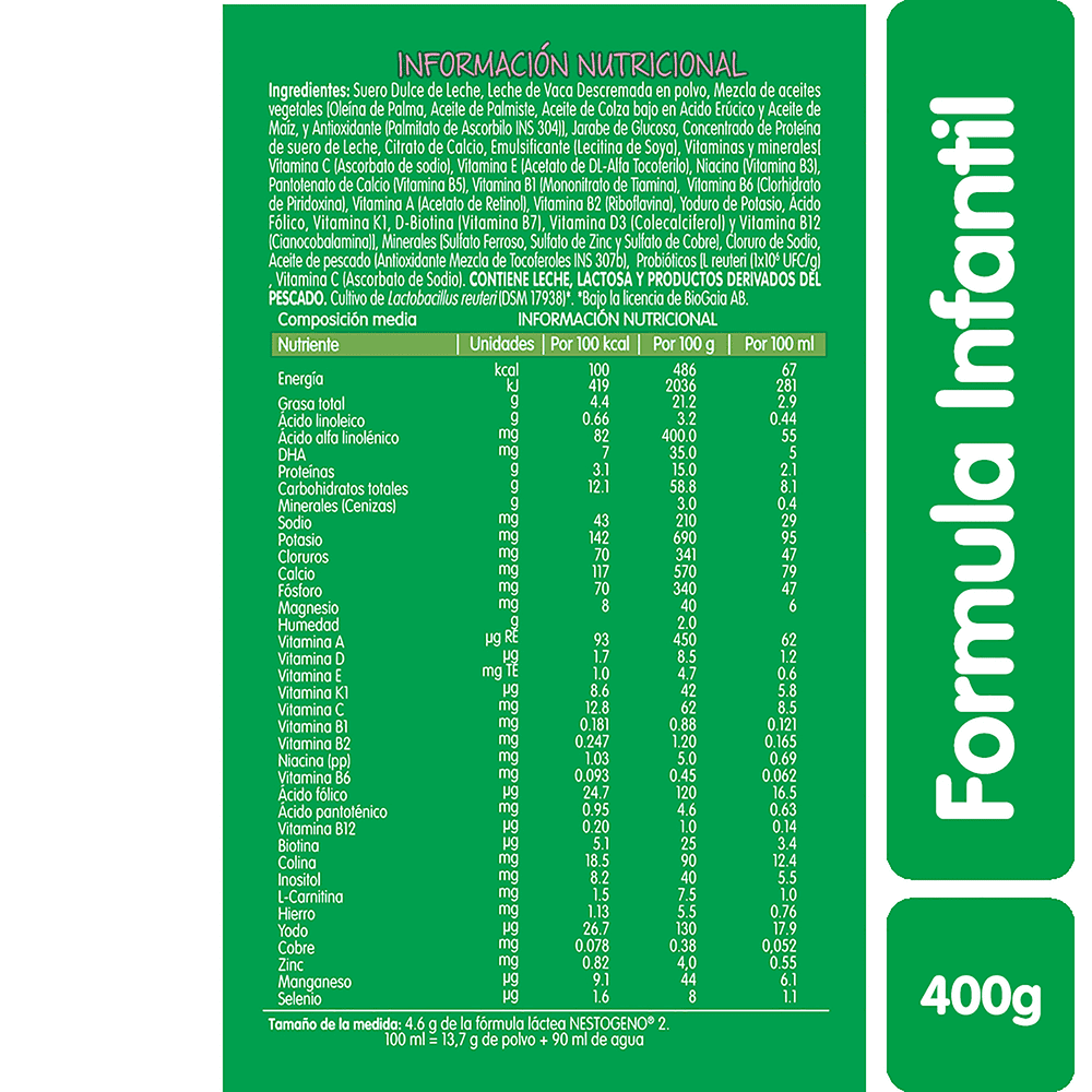 - Ingredientes: Suero de leche desmineralizado en polvo, Mezcla de aceites vegetales [Oleína de Palma, Palmiste, Canola, Maíz y Antioxidante (Palmitato de Ascorbilo)], Jarabe de Glucosa en polvo, Leche descremada en polvo, Citrato de Calcio, Emulsificante (Lecitina de Soya), Minerales [Sulfato Ferroso, Sulfato de Zinc, Sulfato de Cobre y Selenato de Sodio], Vitaminas y Minerales [Vitamina C, Taurina, Inositol, Vitamina E, Niacina, Pantotenato de Calcio, Vitamina B1, Vitamina A, Vitamina B6, Sulfato de Manganeso, Vitamina B2, Yoduro de Potasio, Ácido Fólico, Vitamina K1, Biotina, Vitamina D3 y Vitamina B12], Cloruro de Magnesio, Probióticos [Lactobacillus reuteri 1x106 UFC/g], Cloruro de Sodio, Cloruro de Potasio, Citrato de Potasio y L-Carnitina.