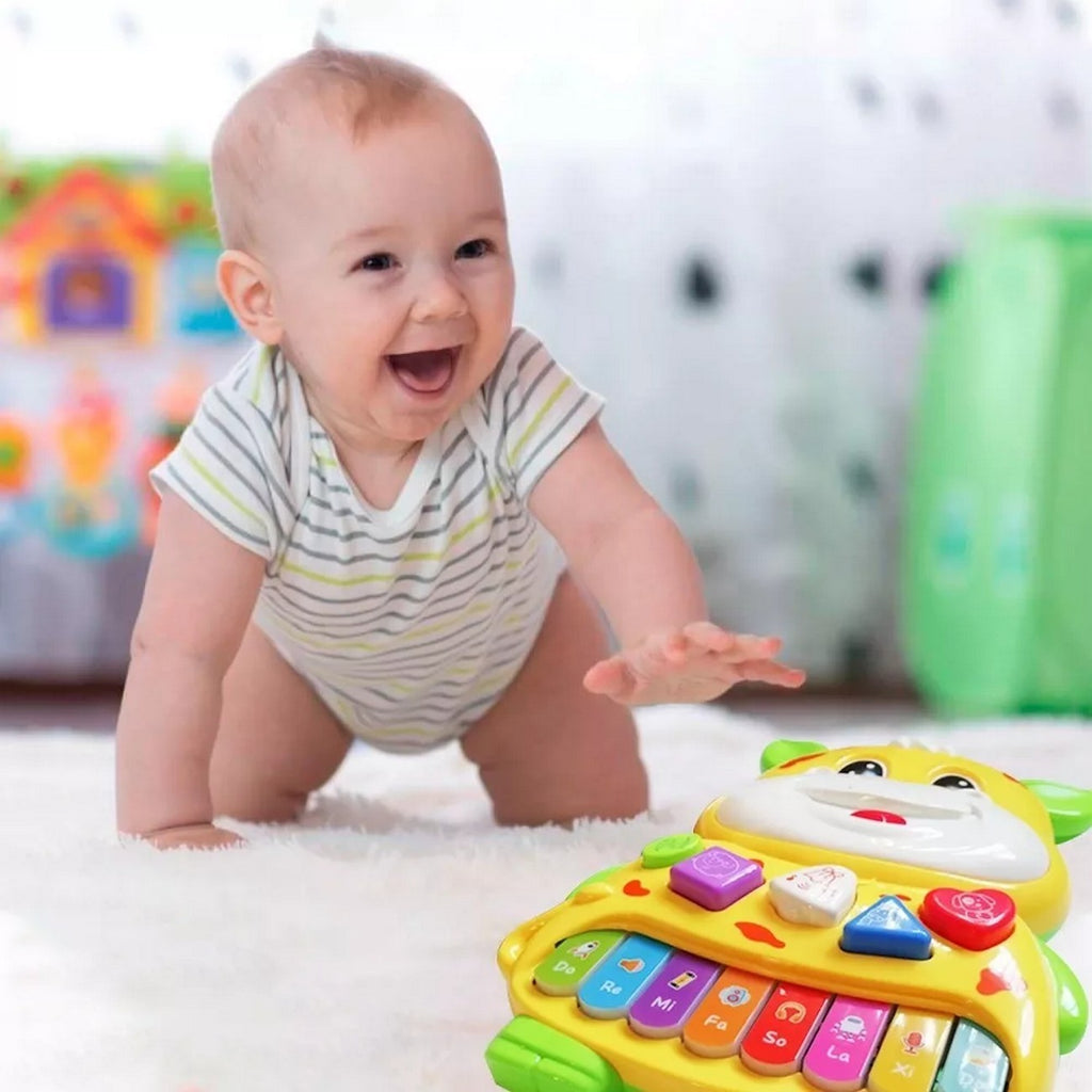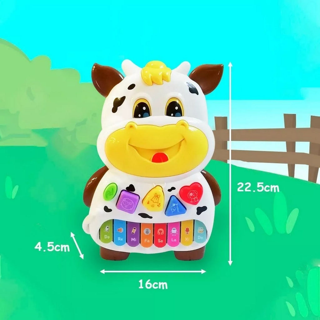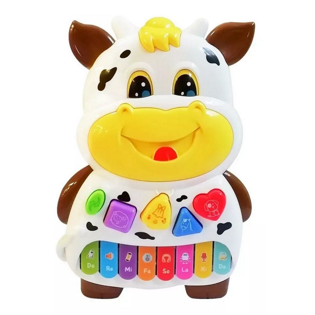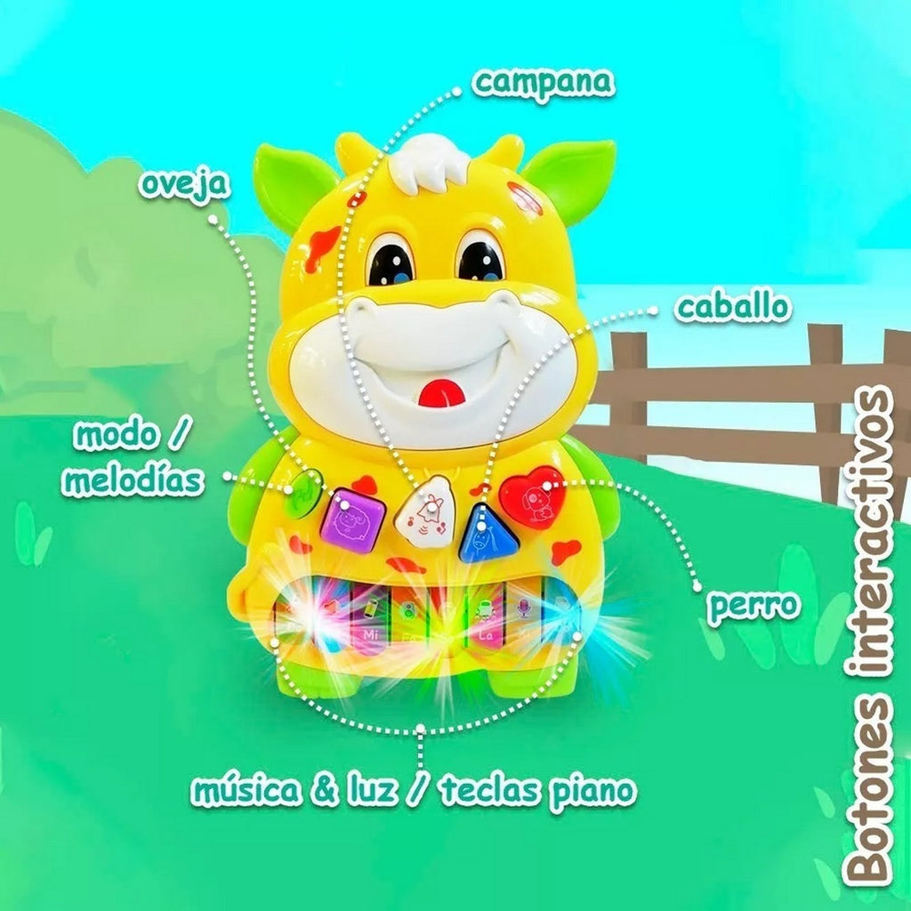 El piano interactivo de vaca para bebés y niños es un juguete educativo diseñado para estimular la curiosidad y el aprendizaje musical de los pequeños. Este juguete cuenta con sonidos de animales divertidos y las notas musicales para fomentar el desarrollo musical de los niños. El piano tiene un diseño colorido y atractivo que resulta muy agradable para los niños. Cuenta con botones grandes y fáciles de presionar que emiten sonidos de animales como el perro, el gato y la vaca. También incluye las notas musicales para que los niños aprendan a reconocerlas mientras juegan y se divierten.