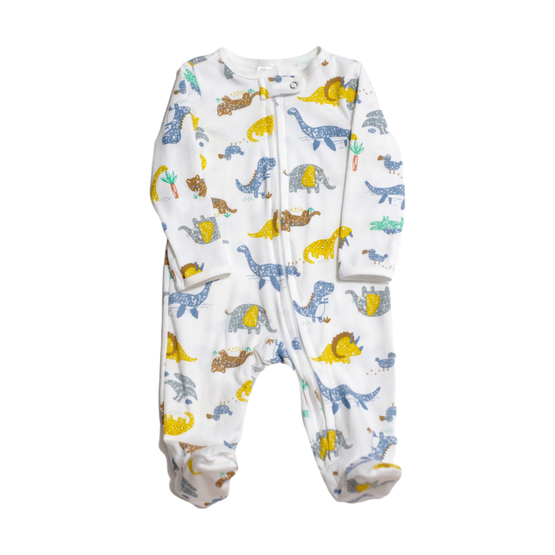 Pijama manga larga para recién nacido niño de 0 a 6 meses. Diseño con pies. Cuello redondo. Cierre con cremallera. Estampados alusivos a dinosaurios coloreados.