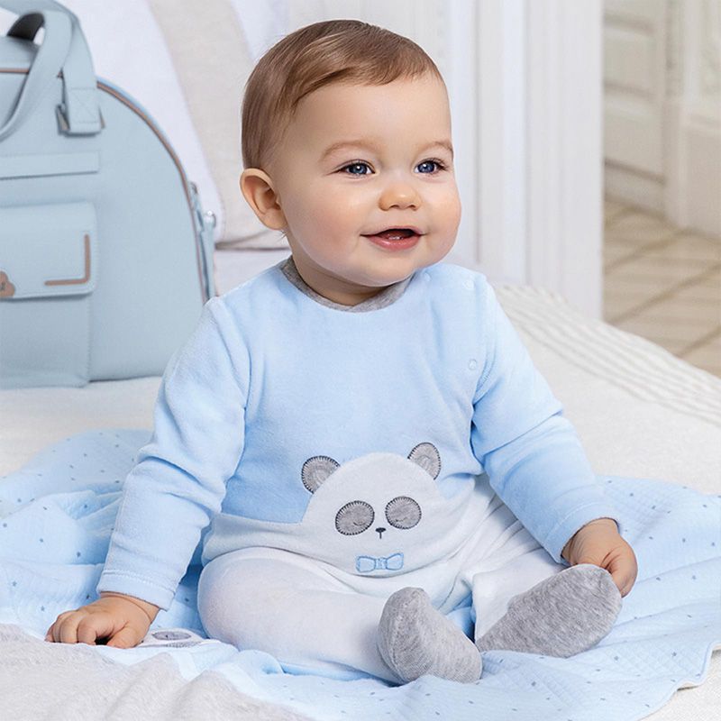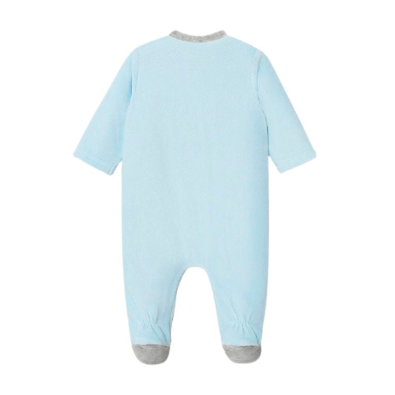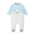 Pijama manga larga para recién nacido niño de 0 a 18 meses. Cuello redondo en distinto color. Cierre con cremallera y botón. Cálido tejido de algodón con tacto suave y aterciopelado. Elementos de adorno: aplique de orejitas, aplique decorativo.