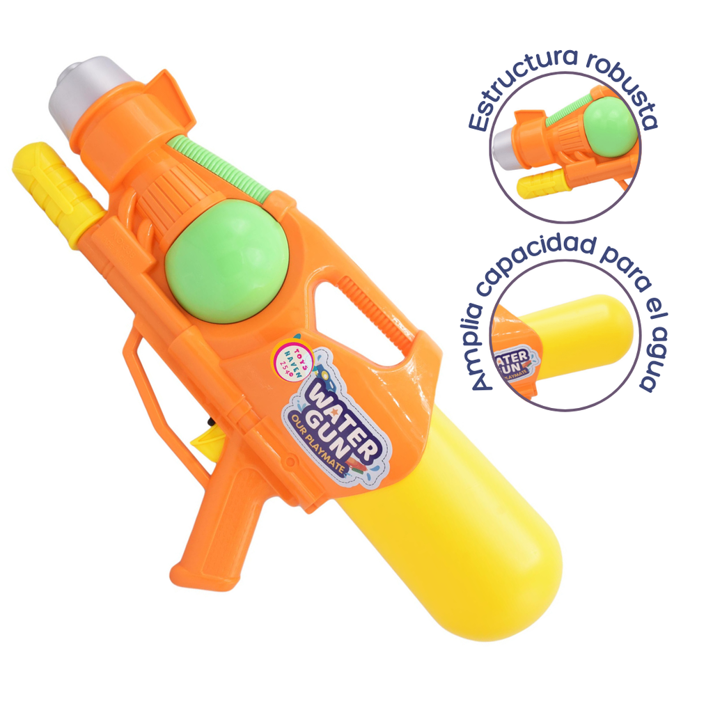 ¡Prepárate para horas de diversión al aire libre con esta colorida pistola de agua! Diseñada para niños, es ligera, fácil de usar y perfecta para jugar en el parque, la piscina o en el patio de casa. Su diseño vibrante y depósito amplio aseguran que nunca te quedes sin agua en medio