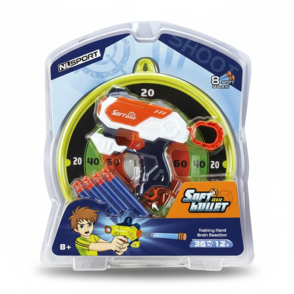¡Diviértete a lo grande con la pistola de dardos de espuma! Esta pistola de juguete de 18 cm incluye una diana de 24 cm y 8 dardos de espuma. Es perfecta para que los niños a partir de 3 años jueguen de forma segura y emocionante. La