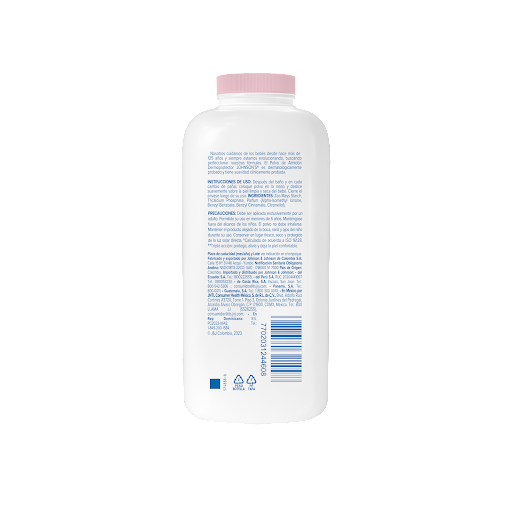 Modo de uso: Después del baño y en cada cambio de pañal, coloque polvo en la mano y deslice suavemente sobre la piel limpia y seca del bebé. Cierre el envase luego de su uso. Debe ser aplicado exclusivamente por un adulto. Permitido su uso en menores de 6 años. Manténgase fuera del alcance de los niños. El polvo no debe inhalarse. Mantener el producto alejado de la boca, nariz y ojos del niño durante su uso.