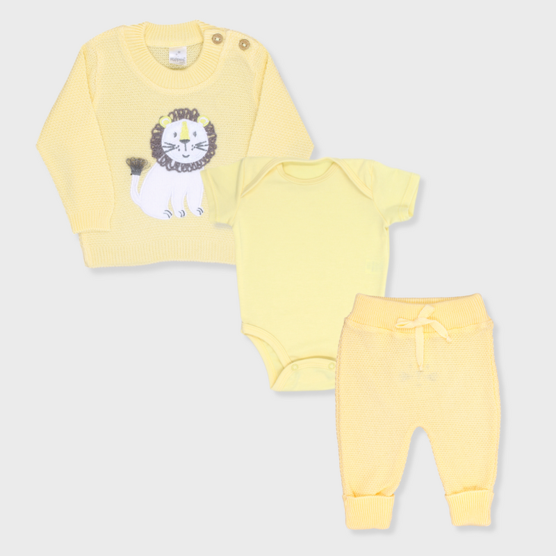 Descubre el set de ropa para bebé "Primer Día", diseñado especialmente para brindar comodidad, protección y estilo en los momentos más especiales de tu pequeño. Este conjunto incluye prendas esenciales como un suéter tejido con diseño de león, un body de algodón, pantalón ajustable, gorro con pompón, babero y calcetines. Todo está confeccionado con materiales hipoalergénicos de alta calidad, ideales para la piel delicada del recién nacido.