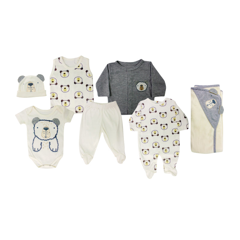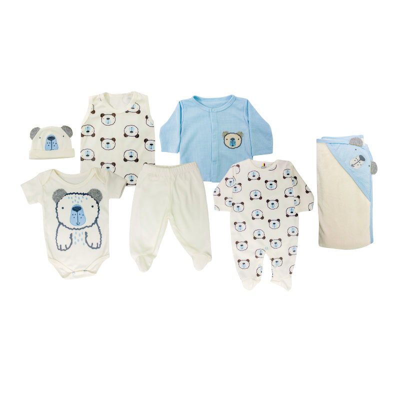 Primer día 7 piezas con bordados y sesgo de colores, ideal para los primeros días de tu bebé.