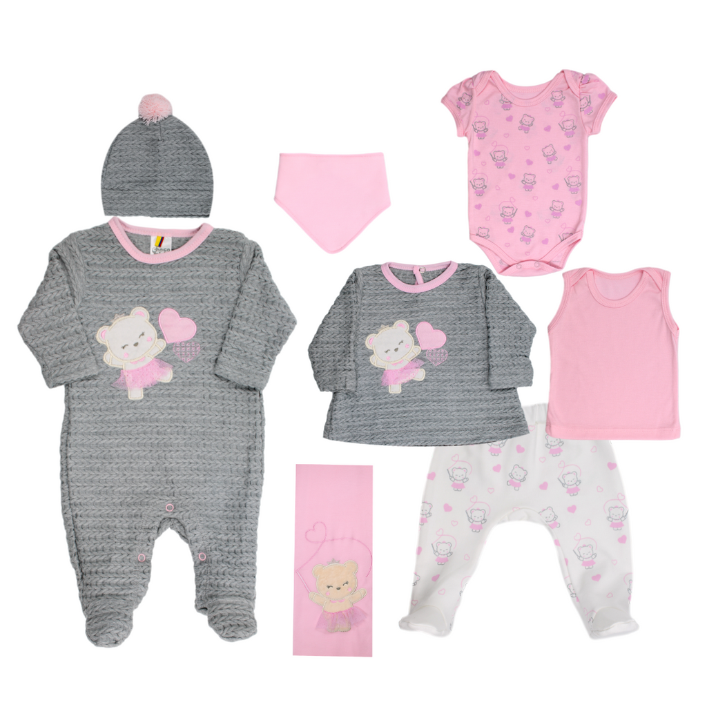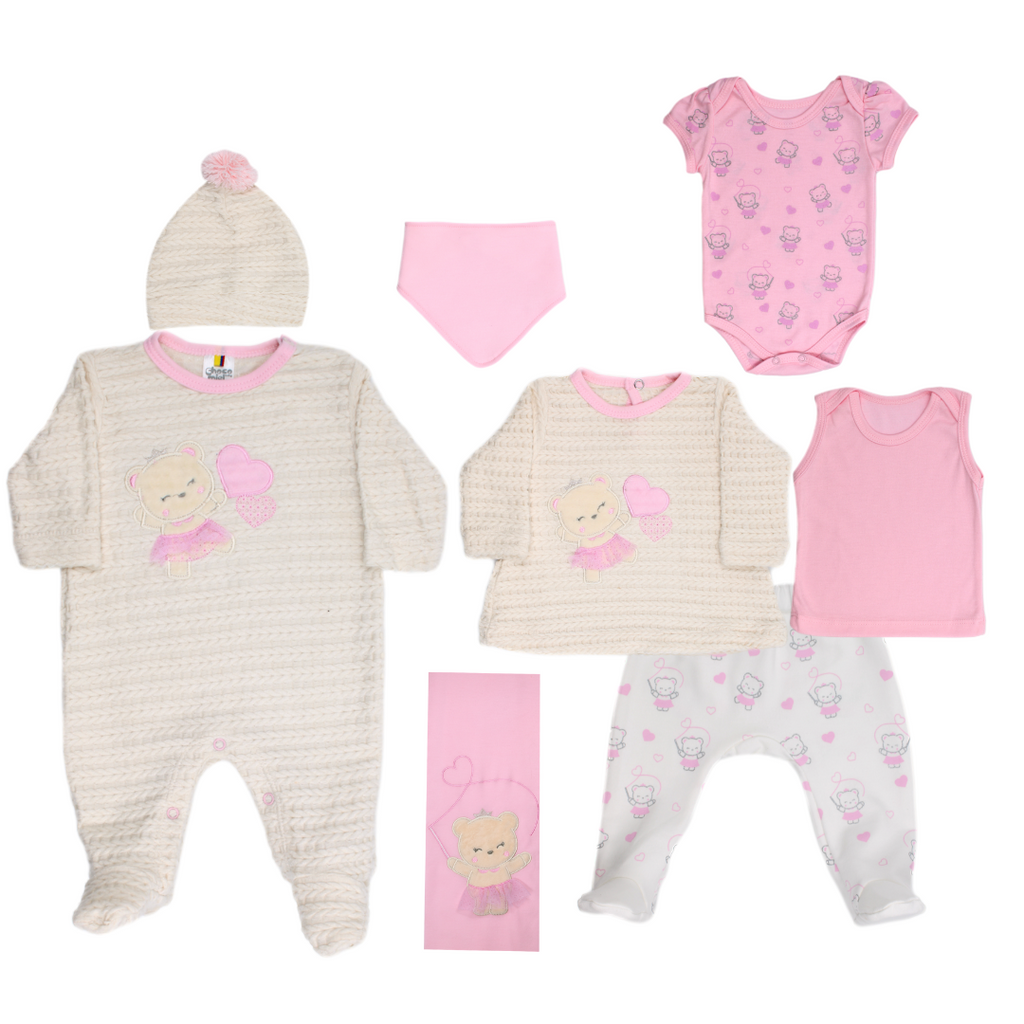 - Set para bebé de 8 piezas body manga corta, pijama manga larga con pies, pantalón con pies, chaqueta manga larga, camisilla, gorro y cobija.