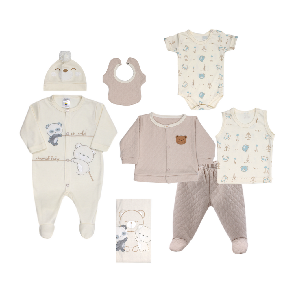 - Set para bebé niño y niña con 8 piezas body manga corta, pijama manga larga con pies, pantalón con pies, chaqueta manga larga, camisilla, gorro y cobija.