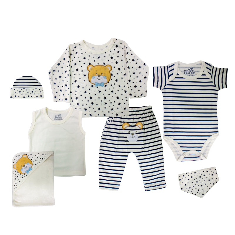 Primer día hilo 7 piezas con bordados, ideal para la llegada del nuevo integrante de la casa. Con cierre en la pijama pie cerrado para mayor facilidad al momento de cambiarlo.