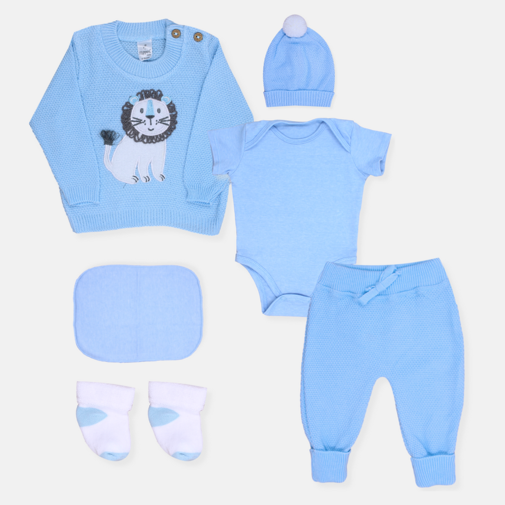 Descubre el set de ropa para bebé "Primer Día", diseñado especialmente para brindar comodidad, protección y estilo en los momentos más especiales de tu pequeño. Este conjunto incluye prendas esenciales como un suéter tejido con diseño de león, un body de algodón, pantalón ajustable, gorro con pompón, babero y calcetines. Todo está confeccionado con materiales hipoalergénicos de alta calidad, ideales para la piel delicada del recién nacido.