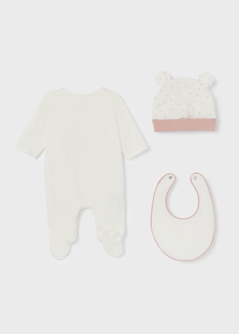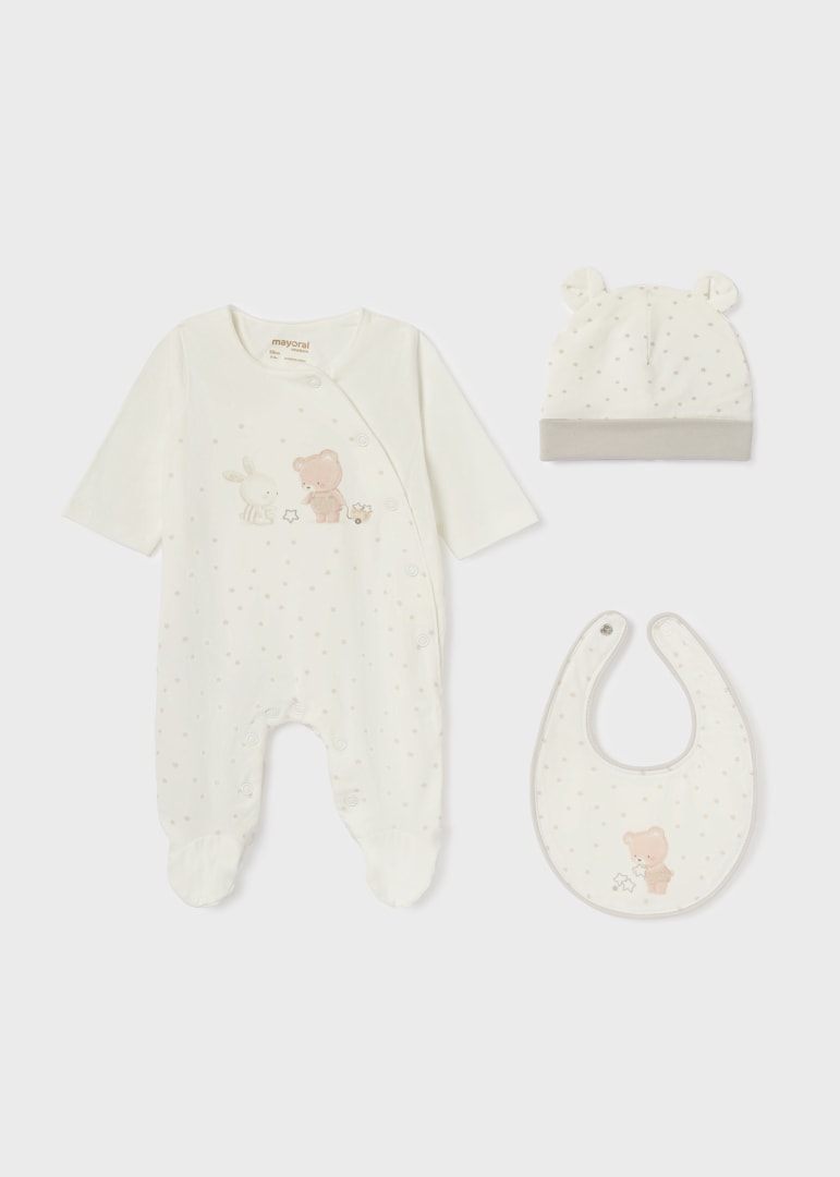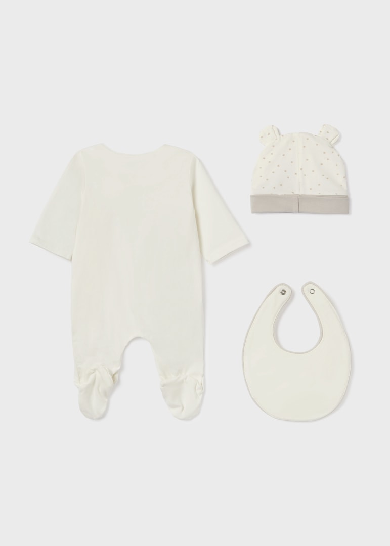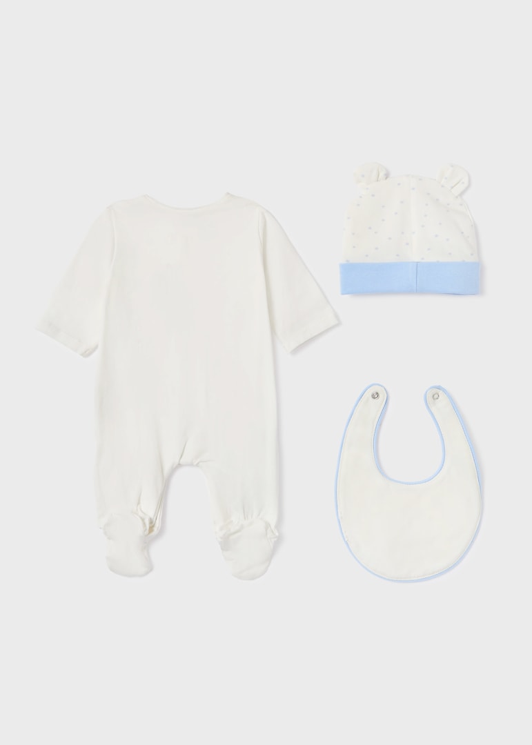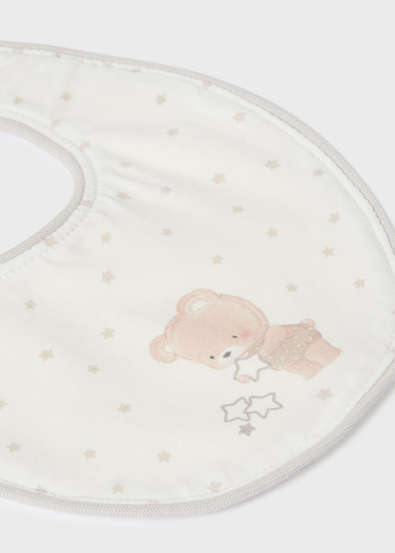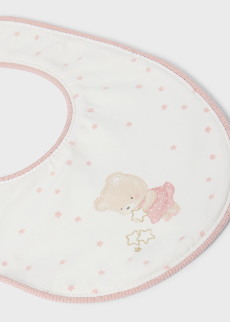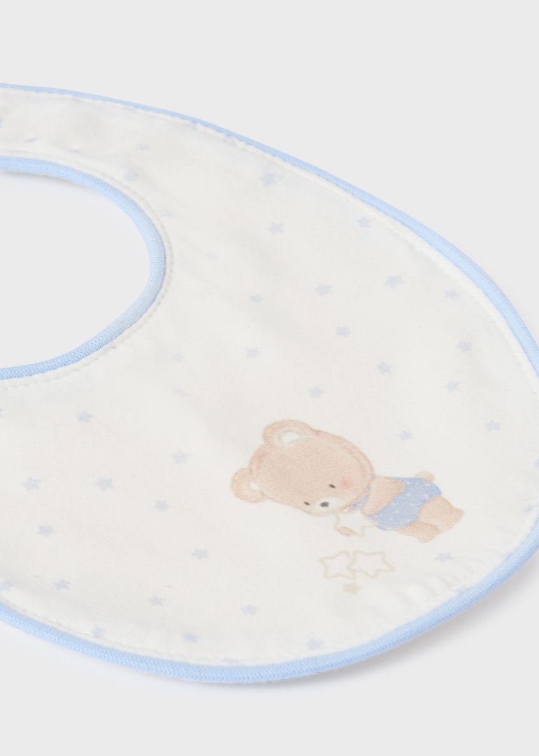Babero para bebé. Cierre con un único botón. Este artículo se presenta en una caja de la línea Newborn ideal para regalar en ocasiones especiales. Este modelo está disponible en talla 0 o primera puesta.