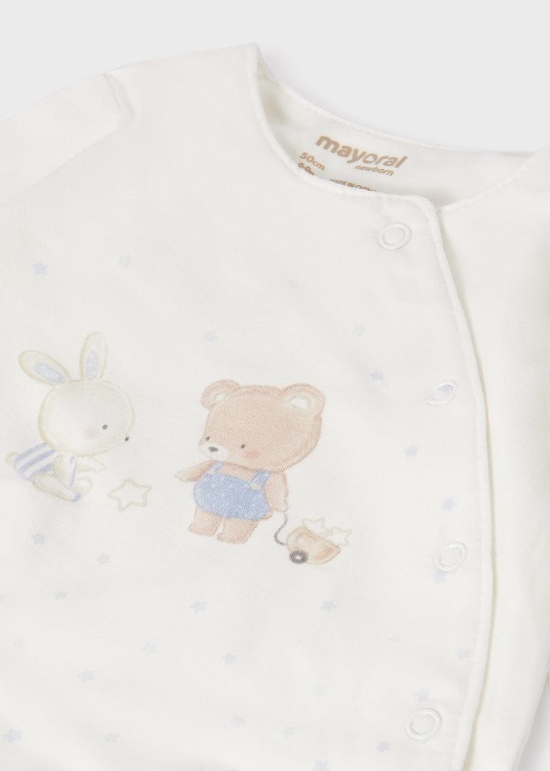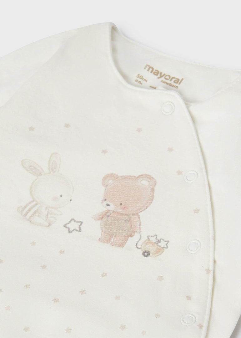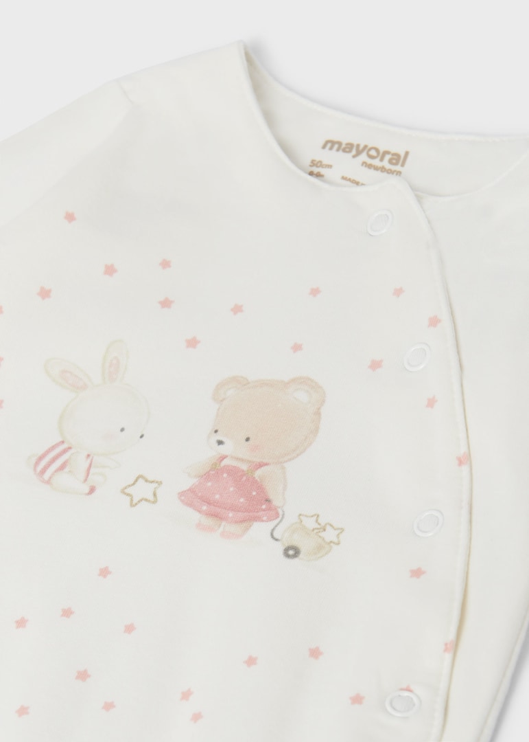 Cierre con botones a presión en la entrepierna para facilitar la puesta de la prenda. Diseño con delicados motivos infantiles.