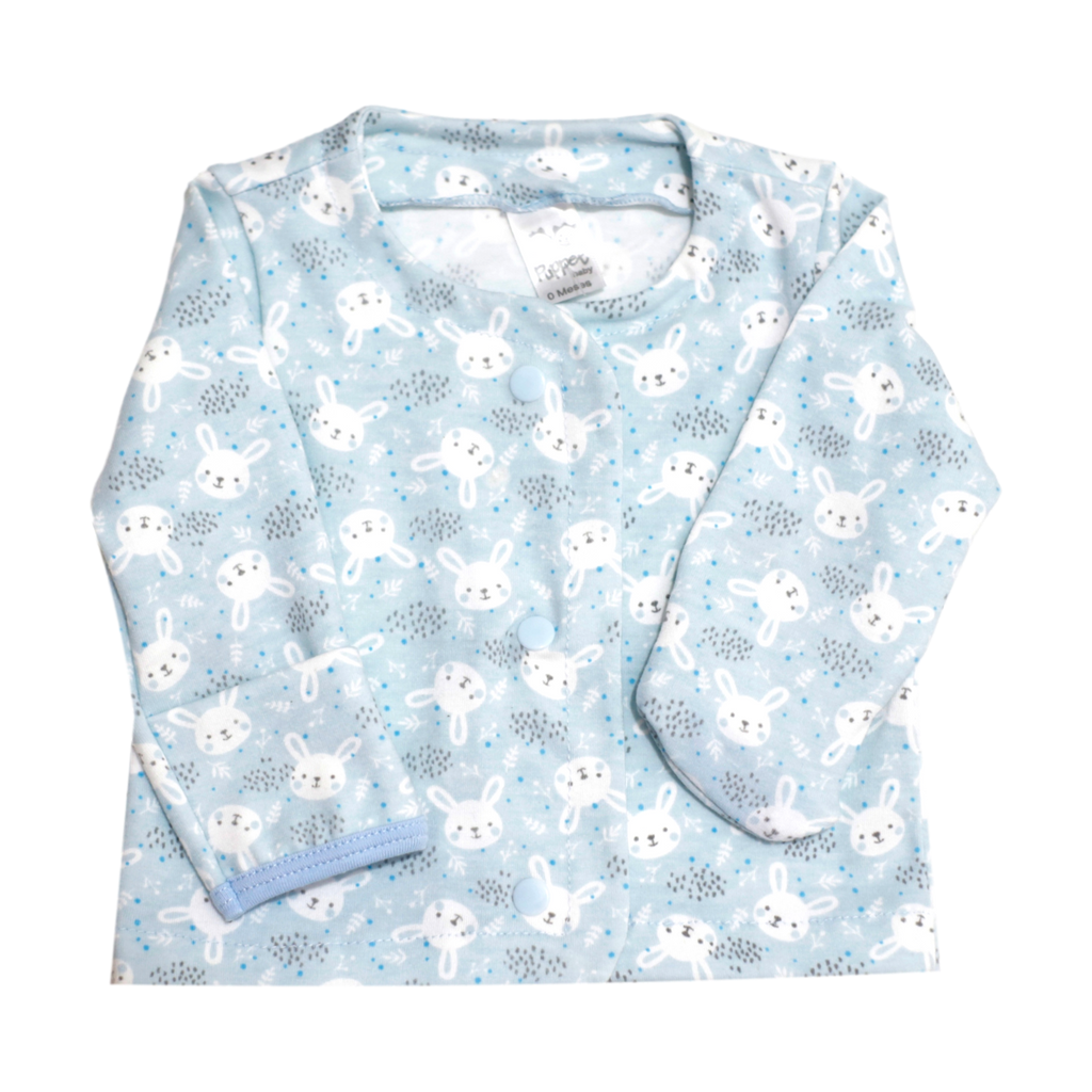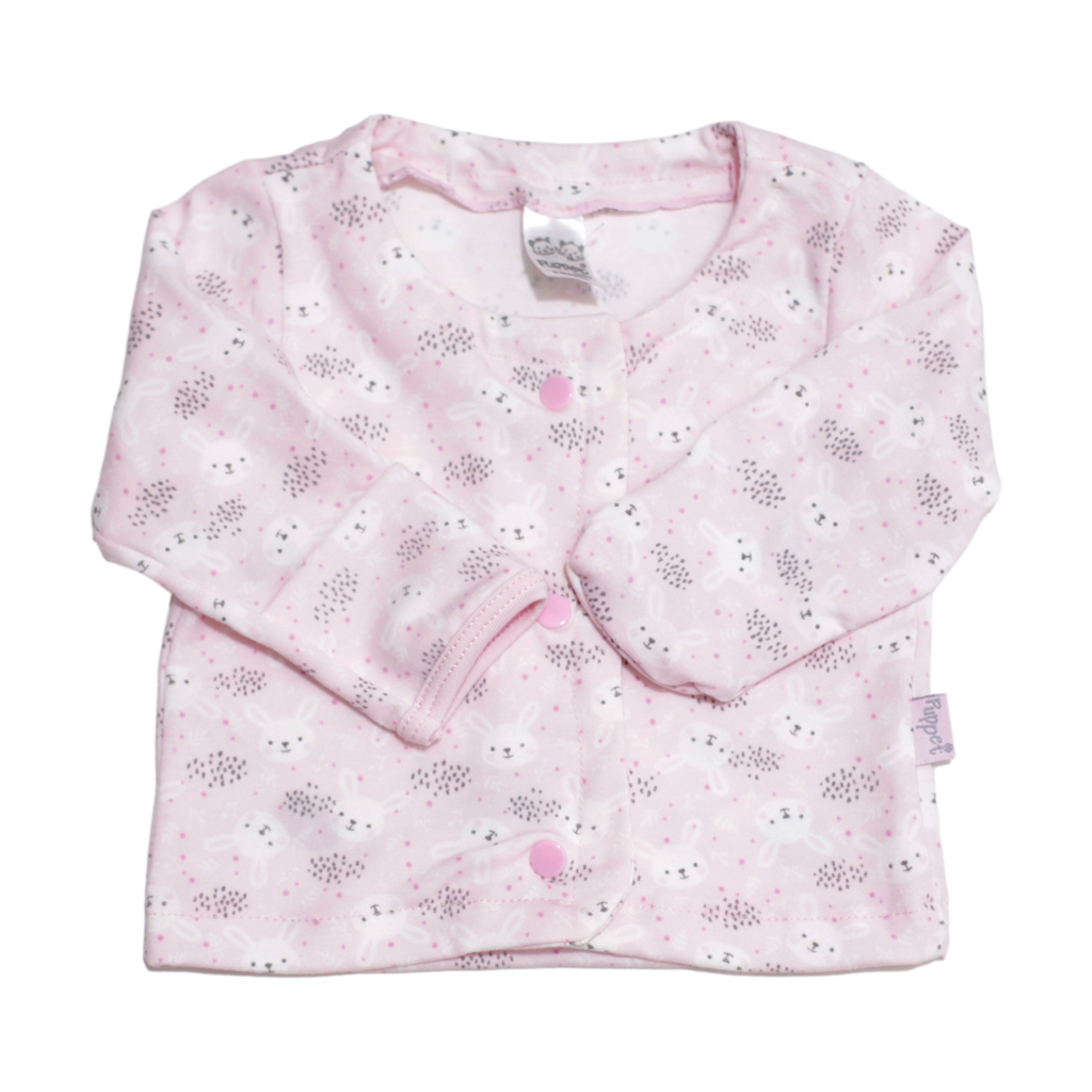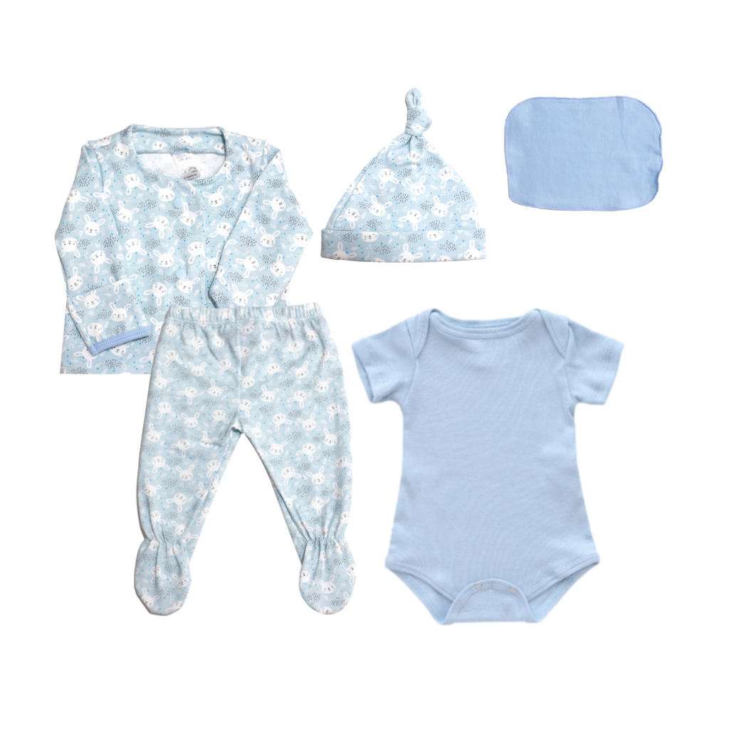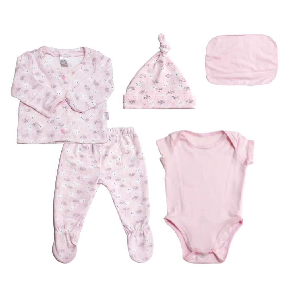 Conjunto 5 piezas ¡Ideal para los primeros días de tu princesa o principe! Tela ultra suave, diseño de conejitos, La manga de la camisa puede usarse como manopla, con boyones para mayor comodidad al cambiarlo. El pantalón de la pijama es enterizo para darle mayor abrigo a tu bebé.
