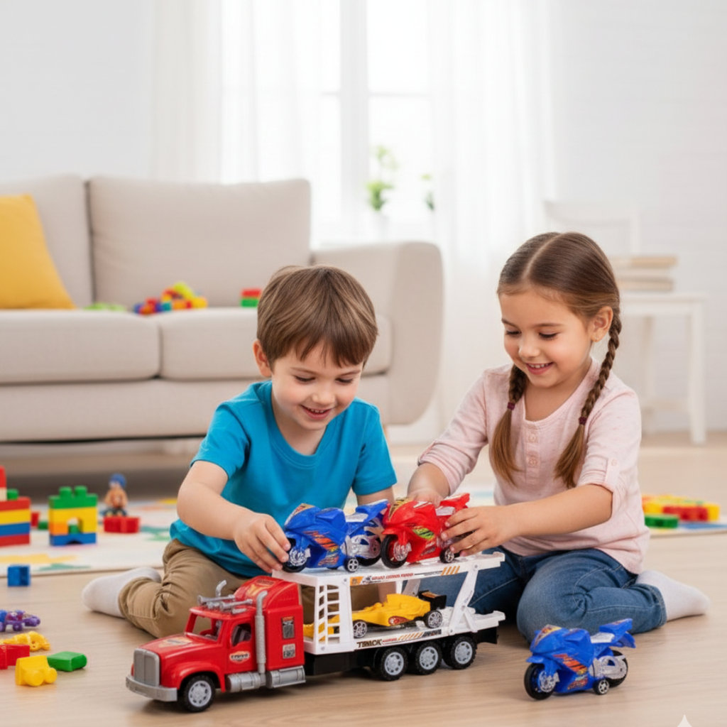 Este es un camión de transporte de vehículos de juguete, de gran tamaño, impulsado por un sistema de fricción que permite moverlo con inercia. El set incluye un tractocamión rojo con un remolque de dos niveles, que viene cargado con dos motocicletas (roja y azul) y dos coches de carrera amarillos. Es un juguete de plástico diseñado para niños mayores de 3 años, ideal para el juego de simulación y el desarrollo de la imaginación en escenarios de transporte y carretera.
