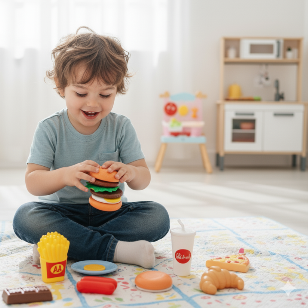 Fomenta el juego imaginativo, el juego de roles (como ser cocinero, mesero o cliente), la interacción social y el reconocimiento de alimentos, viene en un blíster de cartón y plástico transparente, típico de los juguetes pequeños o sets de juego económicos.