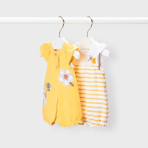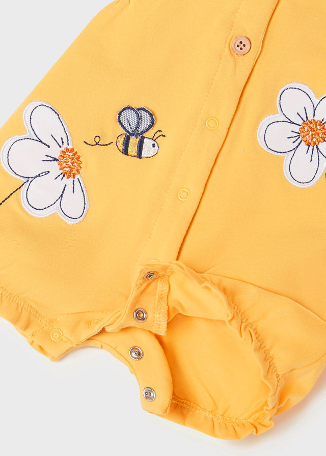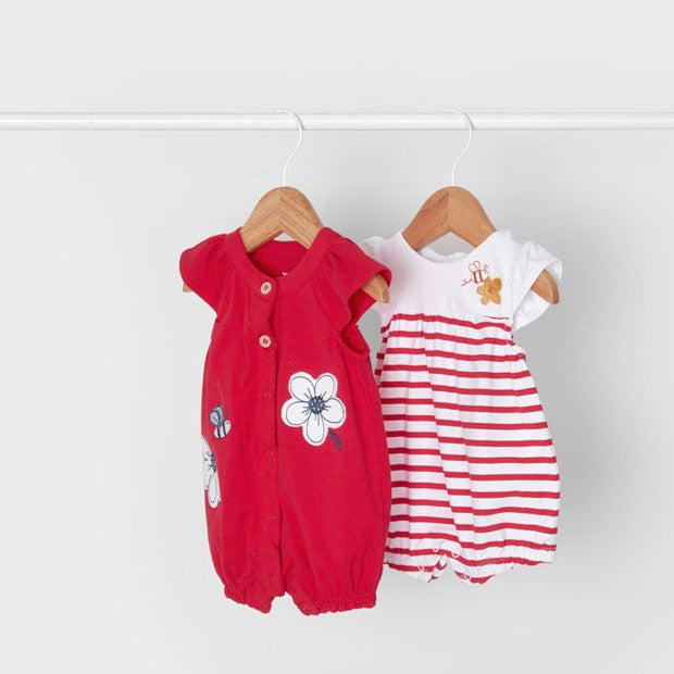 Set de tres piezas para recién nacida niña de 0 a 9 meses. Cuello redondo con goma elástica. Cierre con botones a presión en la entrepierna. Suave tejido de algodón elástico.
