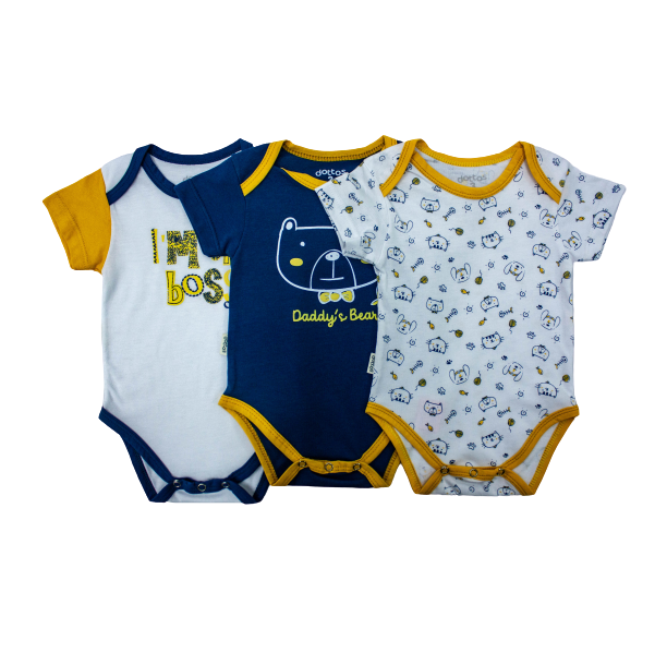 Body por 3 unidades con estampados y botones en la parte inferior que facilitan la hora de cambiar su pañal. Es una prenda básica, suave y fresca que no puede faltar en el ropero de tu bebé. Variedad de motivos y colores. Elaborado en algodón.