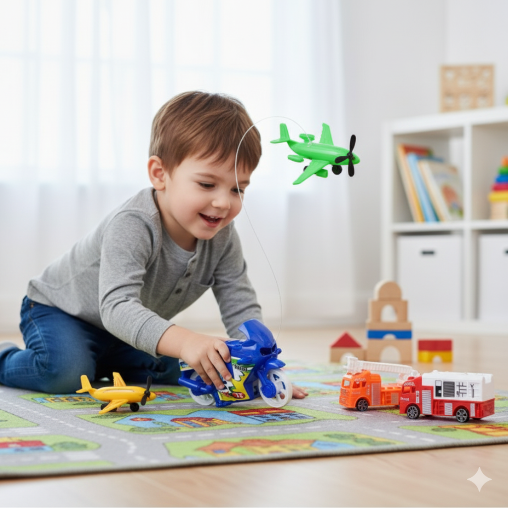 Este es un set de juguetes de "Alta Velocidad y Potencia" que ofrece una mezcla de vehículos y aeronaves para niños a partir de años. El set incluye un vehículo principal de motocicleta de carreras azul, complementado con dos camiones de emergencia (uno naranja y uno rojo) y varios aviones de juguete (incluyendo modelos verde y amarillo). Es un set variado ideal para el juego de rol de carreras, rescate y transporte aéreo.