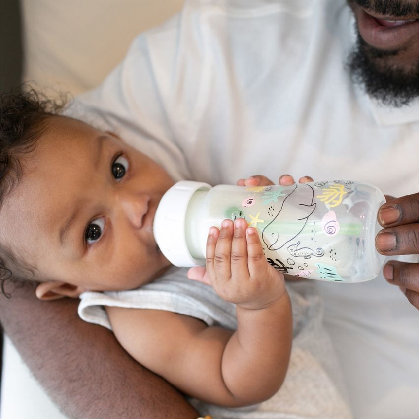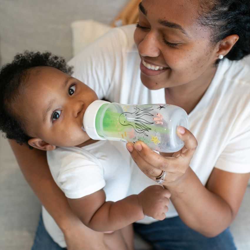 * Hecho para crecer con el bebé, nuestro biberón está diseñado para nutrir a través de las etapas de alimentación del bebé y es reciclable. Seguro para usar en lavavajillas (solo en la rejilla superior), esterilizadores eléctricos y de microondas o agua hirviendo. Libres de BPA.