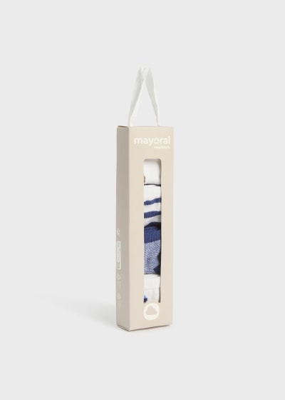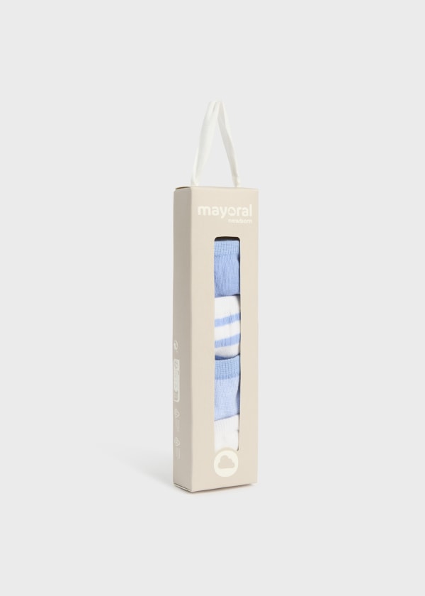 Práctico set de cuatro pares de calcetines para recién nacido. Diseño con delicados motivos infantiles.