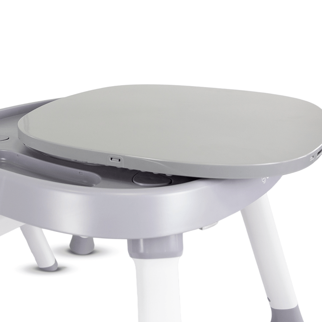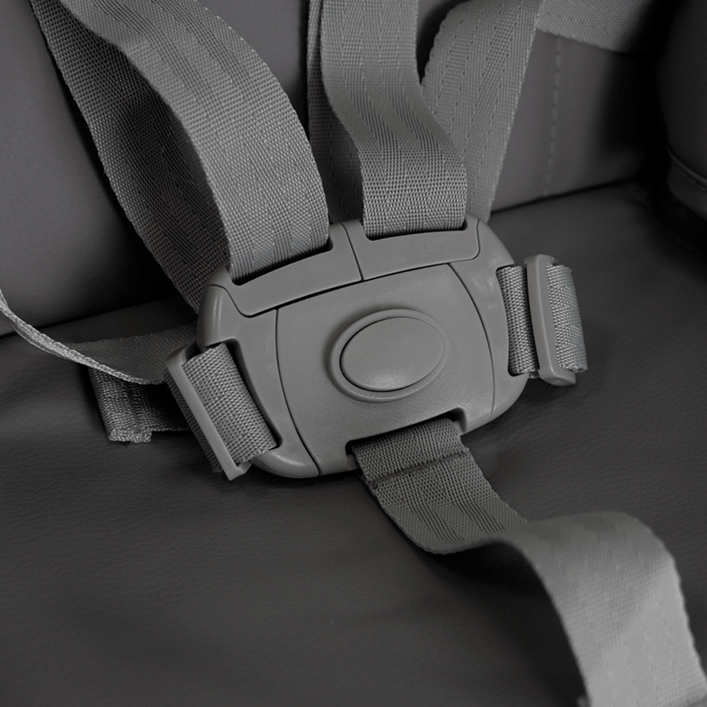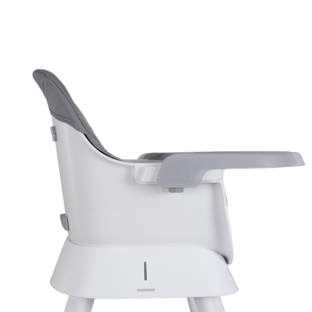 Bandeja removible ajustable en 3 niveles de profundidad. Asiento acolchado con tela en algodón y poliéster que agrega comodidad y suavidad pero también facilita su limpieza. Posee cinturón de seguridad de 5 puntos regulable que añade seguridad y confort. Soportes antideslizantes que añaden seguridad.