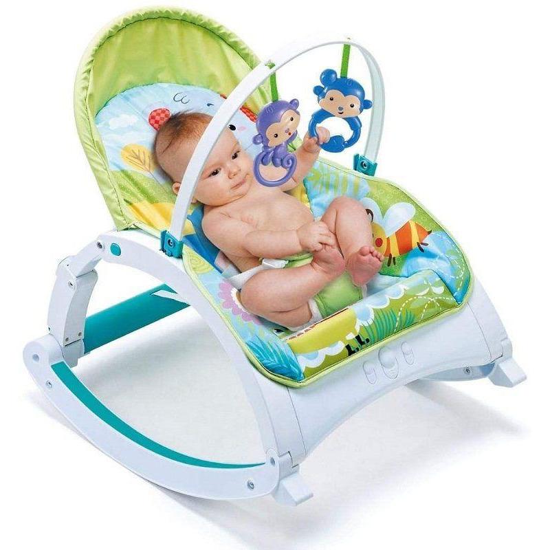 Silla mecedora de líneas elegantes y características increíbles. El asiento cómodo y suave ayuda a relajar a tu bebé con vibraciones relajantes. La barra de juguetes sobre su cabecita lo estimula a alcanzarlos y tocarlos, estimulando su motricidad.