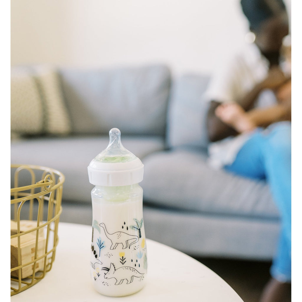 Tus opciones nunca han sido mejores que con el biberón de cuello ancho Anti-Colic Options+™ de Dr. Brown's Natural Flow®, ahora en una presentación estampada con divertidos dibujos infantiles pero conservando su sistema de ventilación interna anticólicos que está clínicamente probado para reducir los cólicos. Con capacidad para 9 onzas, cada tetero cuenta con su sistema de ventilación y está estampado con un divertido motivo de la jungla con toques de lindos colores.