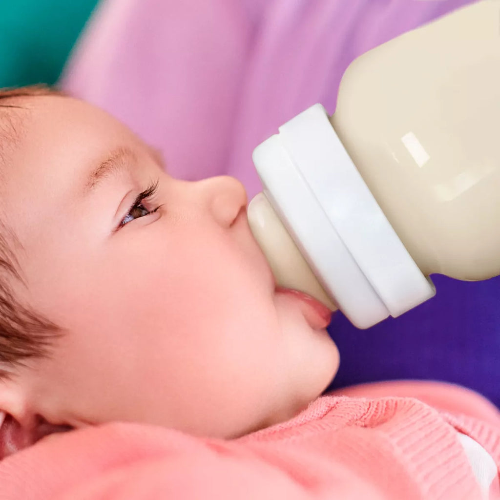 - Biberón de cuello ancho con borde redondeado para facilitar la limpieza