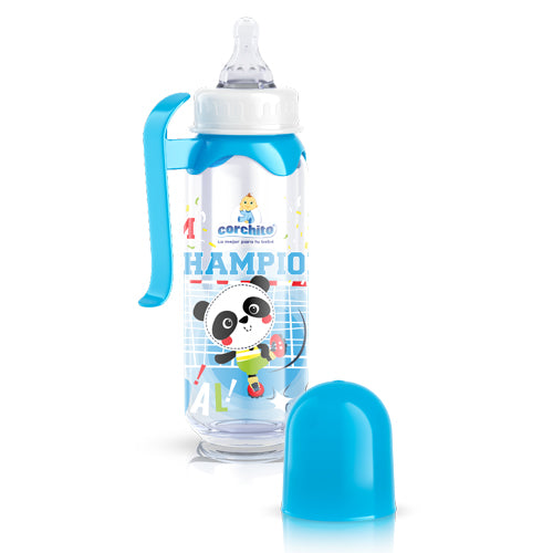 La nutrición es la etapa más importante en el crecimiento del bebe, por esto CORCHITO® cuenta con el Biberón Una Manija que es ideal para los bebes de 4 meses de edad en adelante, su botella es ergonómica de fácil manejo incluso sin manijas. Chupo transparente con 4 canales reguladores de flujo. Manija de práctico agarre, ideal para las manos pequeñas del bebe. Disco que impide el paso del líquido, mientras no está en uso. Sus llamativos colores y tiernos motivos lo hacen la elección perfecta para complementar y facilitar la alimentación del bebe.