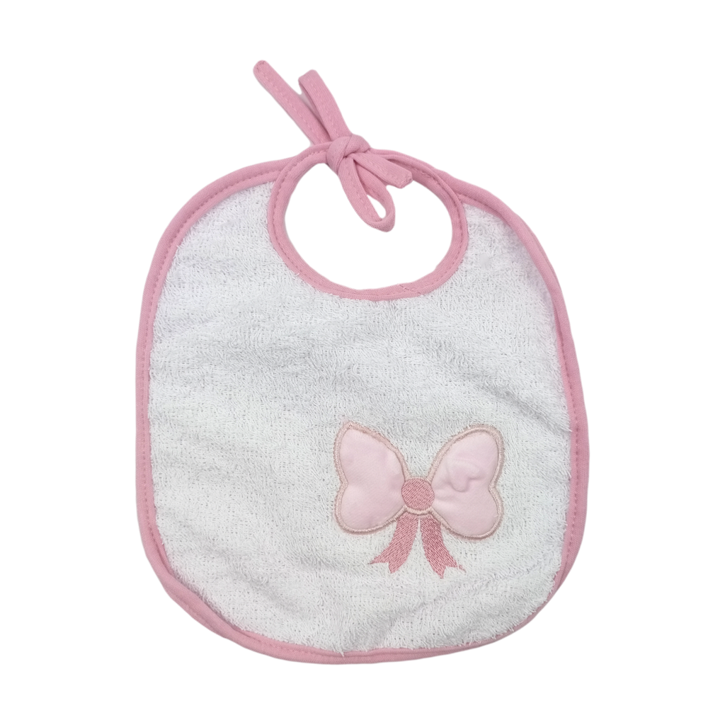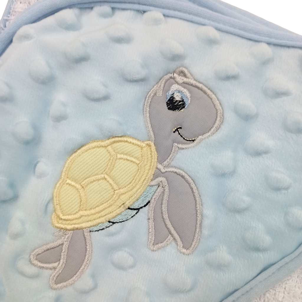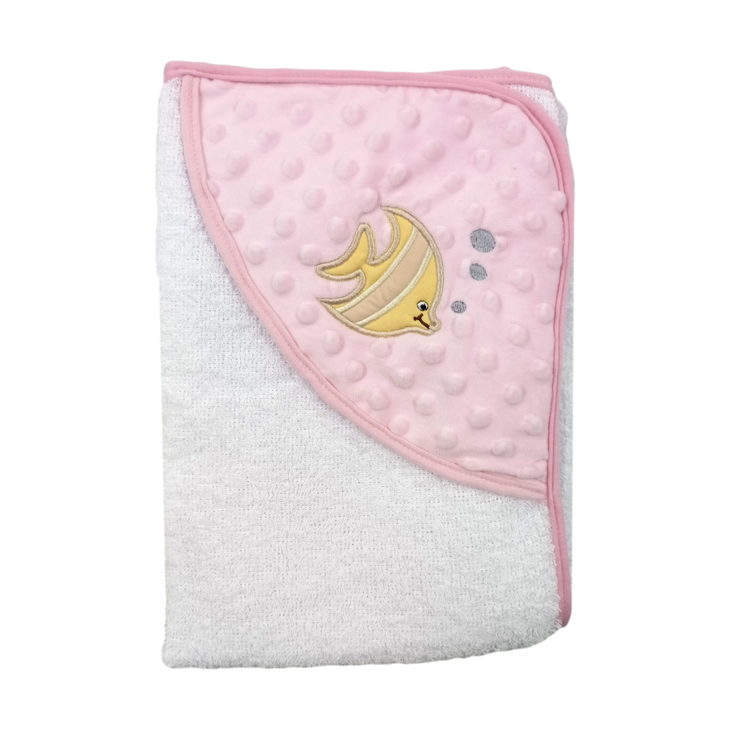 Toalla terry con capota y sesgo de colores bordada. ideal para esos primeros días de tu bebé. Contiene babero bordado.