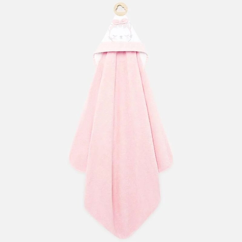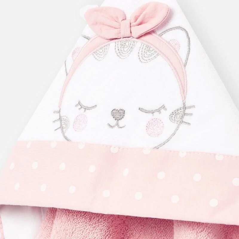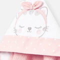 Capa baño o toalla con capucha, con la que podrás secar y abrigar a tu bebé después del baño. Está confeccionada con suave tejido de algodón, con dos caras. Presenta en la parte superior un dibujo bordado de la cara de una gatita con aplique en forma de diadema. Se presenta en una caja, ideal para regalar en ocasiones especiales.