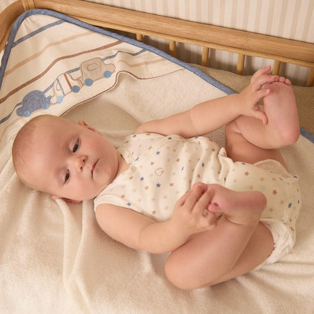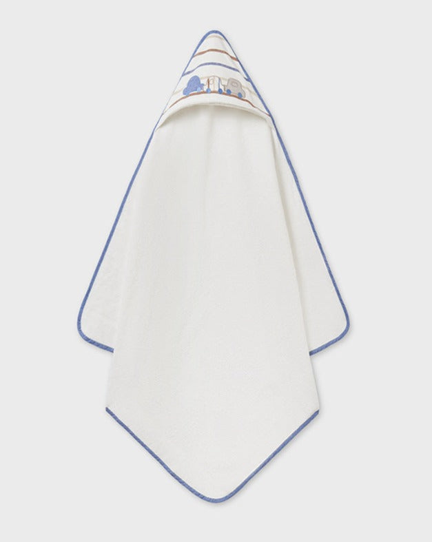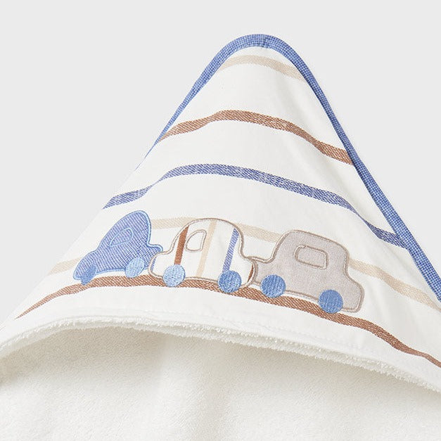 Toalla tipo capa de diseño envolvente con la que podrás secar y abrigar a tu bebé después del baño. Tejido en algodón. Elementos de adorno: aplique decorativo, aplique bordado.