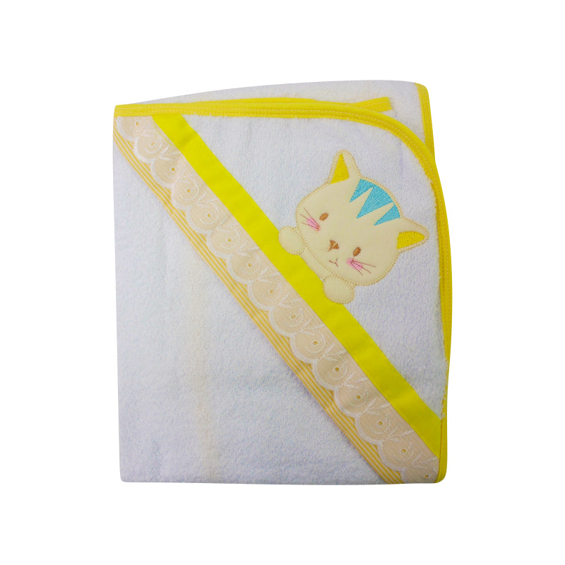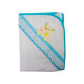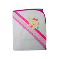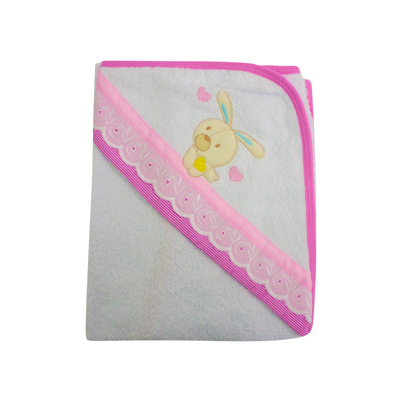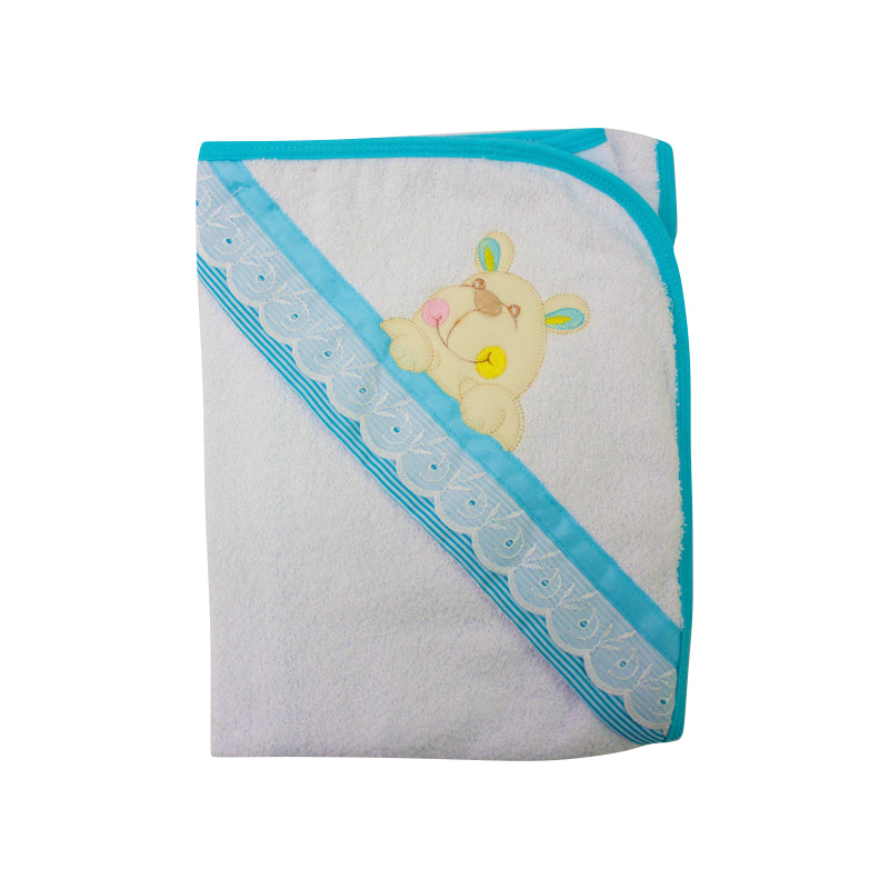 Toalla encaje con bordados y sesgo en colores variados. Capota para que no se caiga la toalla después del baño de tu bebé.