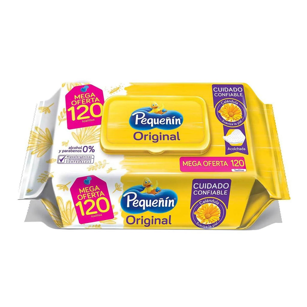 Paquete de toallitas húmedas por 120 unidades de Pequeñín, suaves y delicadas para la piel de tu bebé.