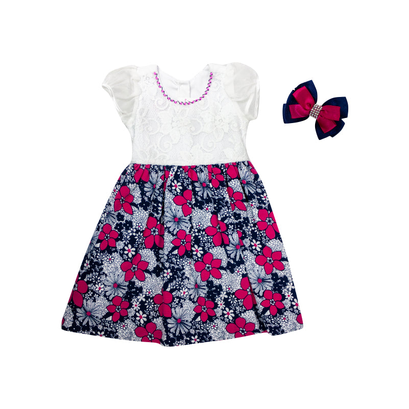 Vestido con estampado de flores, manga cortas y detalles decorativos en el cuello. Contiene gancho para cabello